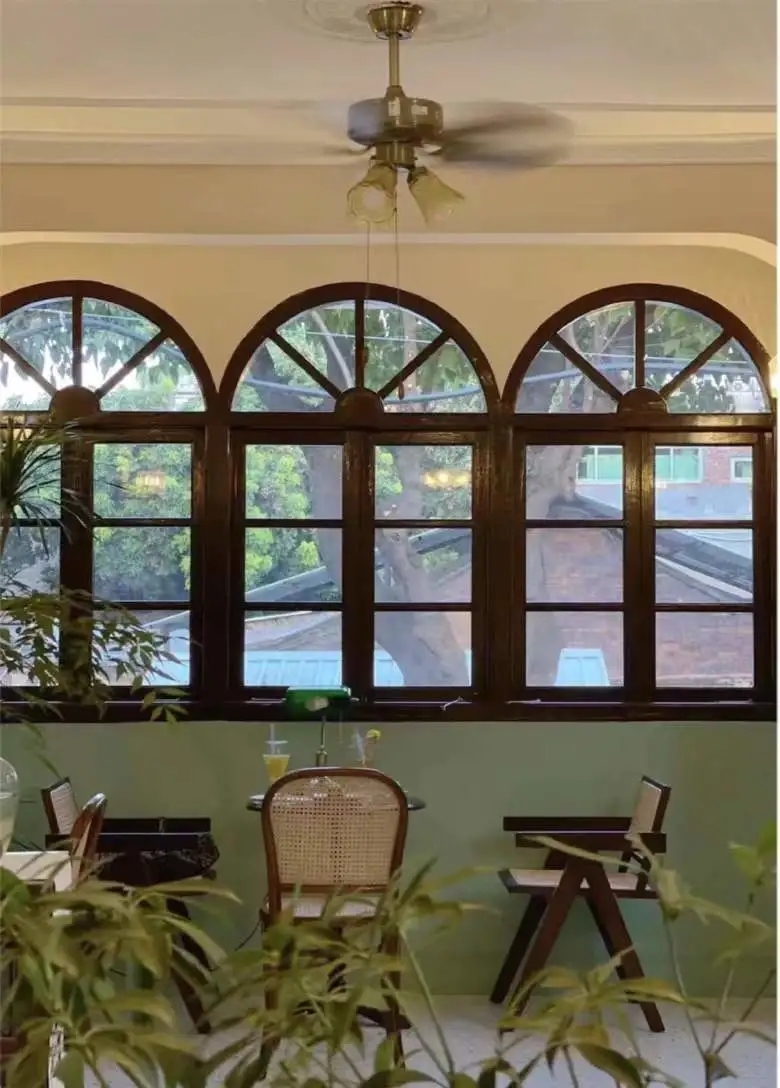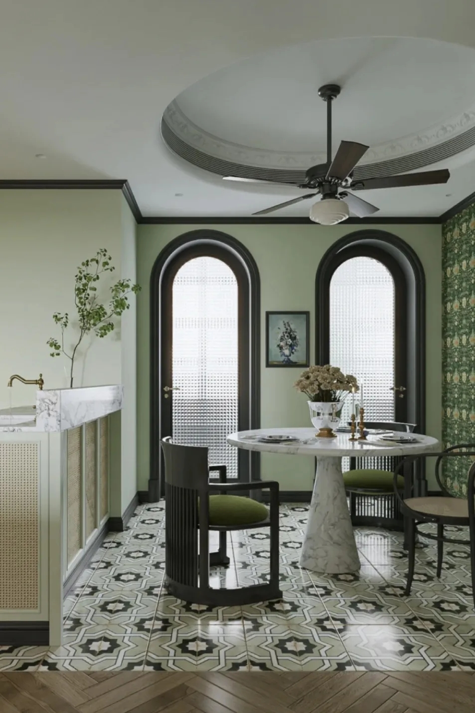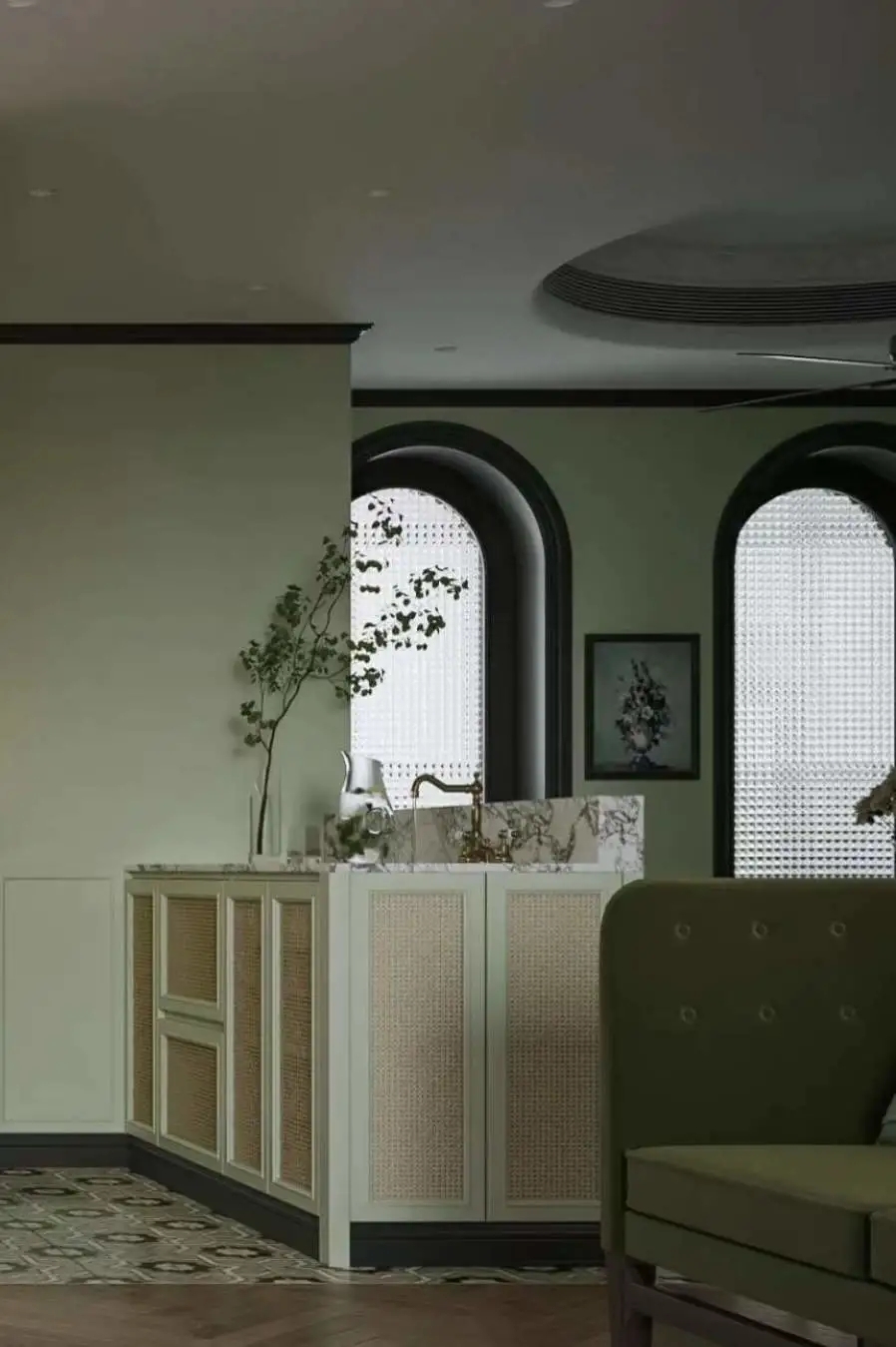 花砖旧物的南洋风格,深浅不同的绿,既轻盈又有层次感,柔和的弧形吊顶搭配拱门,仿佛置身在亚热带季风里,静谧且温暖地将风格的丰富度和层次感勾勒出来。