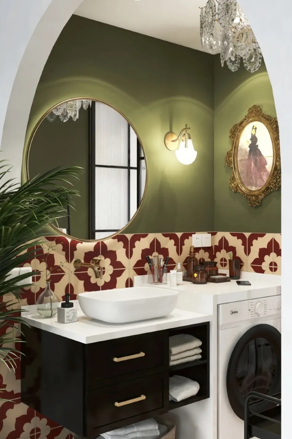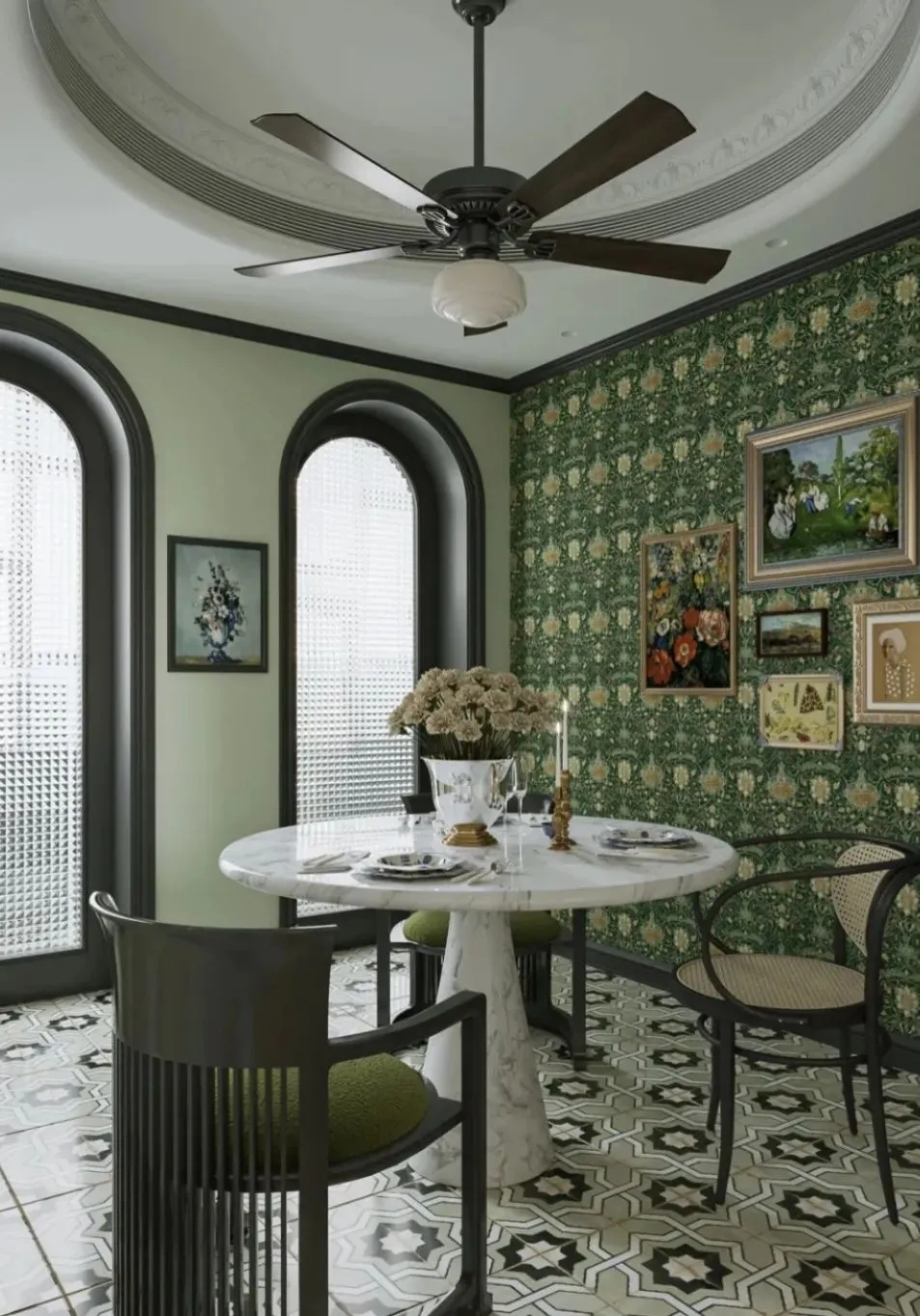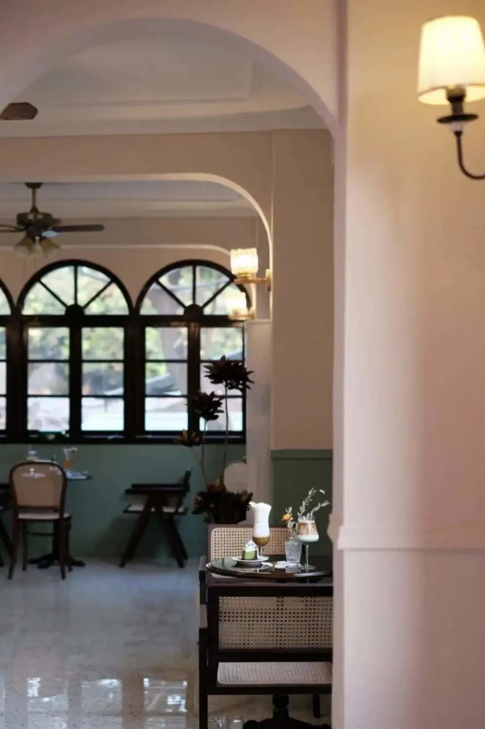 花砖旧物的南洋风格,深浅不同的绿,既轻盈又有层次感,柔和的弧形吊顶搭配拱门,仿佛置身在亚热带季风里,静谧且温暖地将风格的丰富度和层次感勾勒出来。