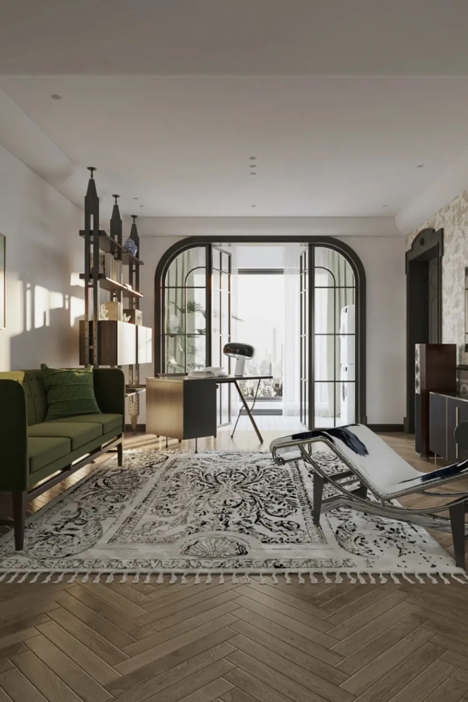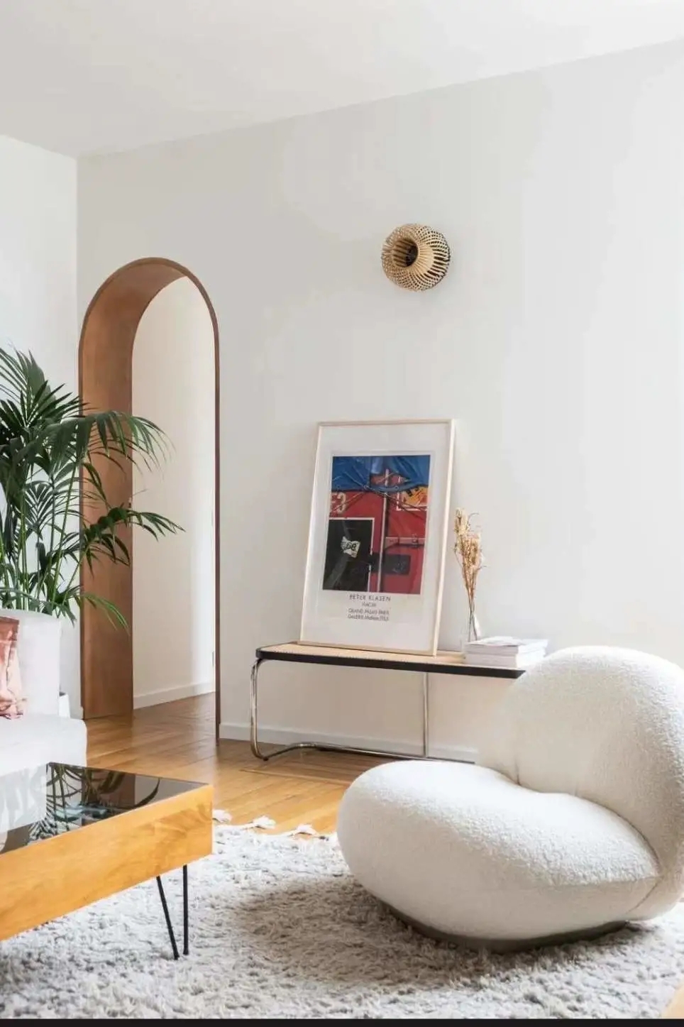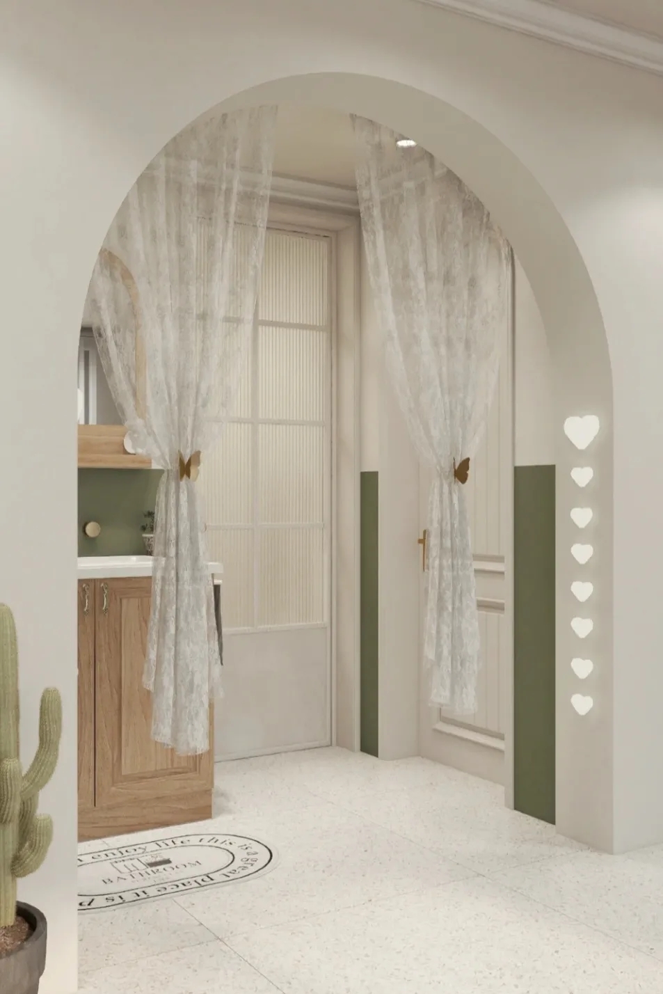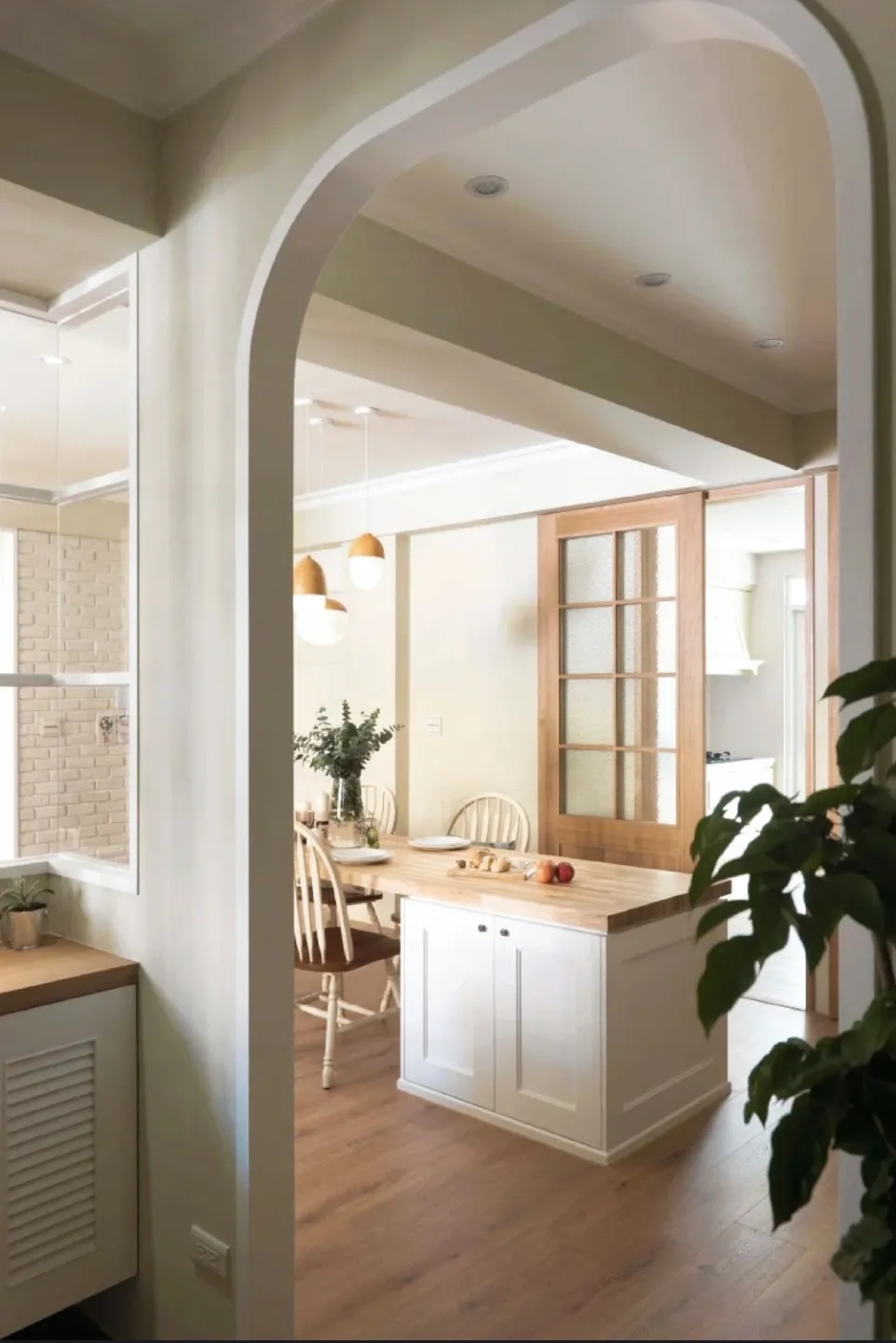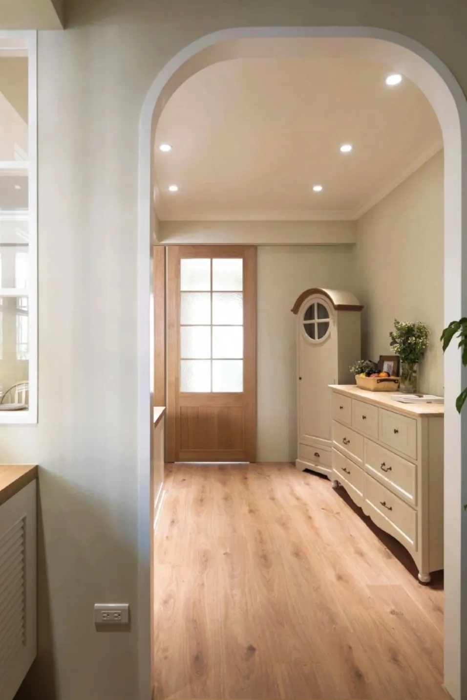 从玄关到客厅一路安装拱门,法式仪式感超足,显大能力MAX。慵懒法式和治愈拱门碰撞出一个充满浪漫元素的家。