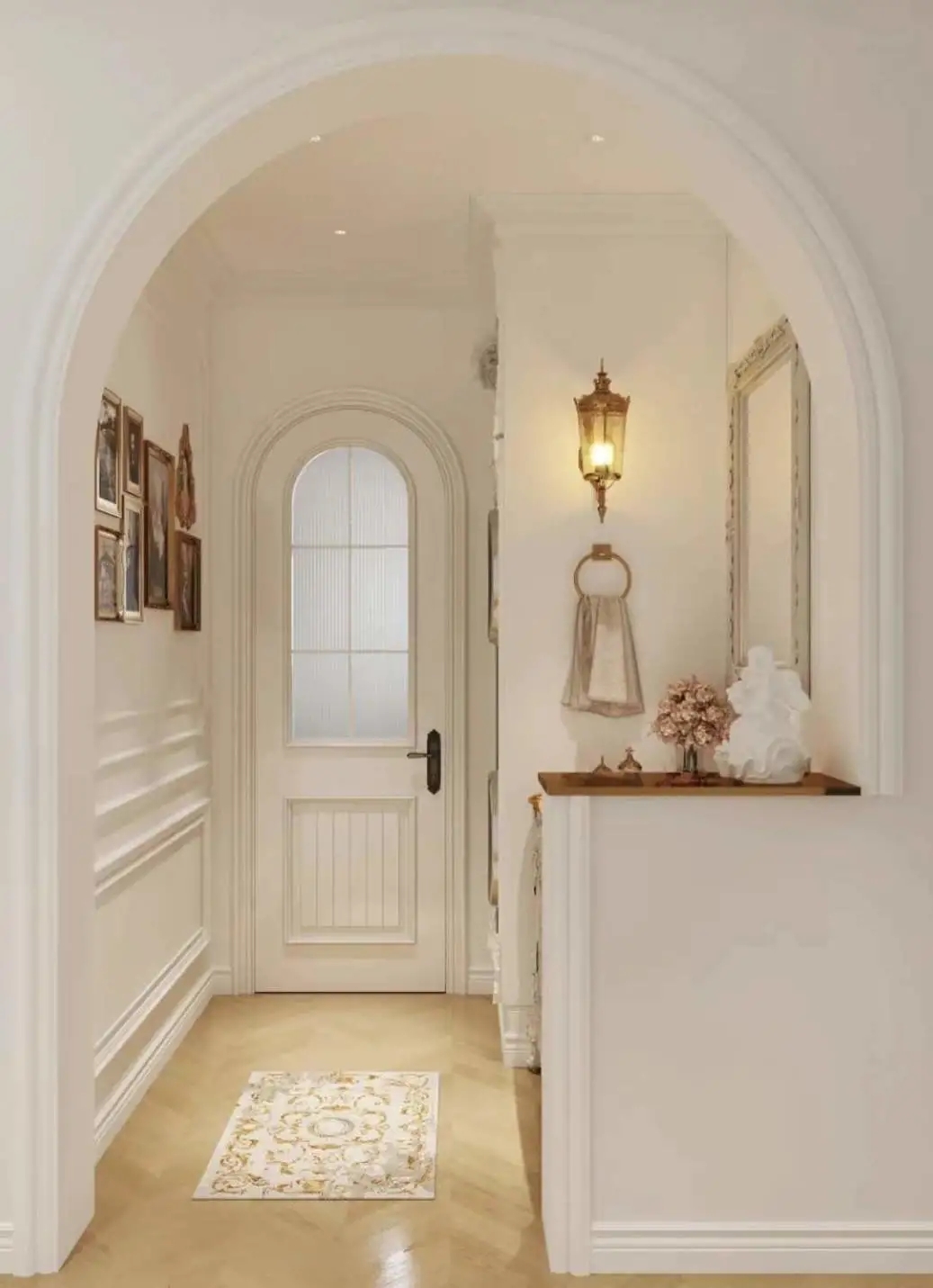 拱门相较于方正的门多了一份柔和浪漫,法国电影里的家经常会有拱门出现,变成了今天的法式风格里的必备除了拱门,石膏造型线条角花灯盘都会给家增贴一份柔美。