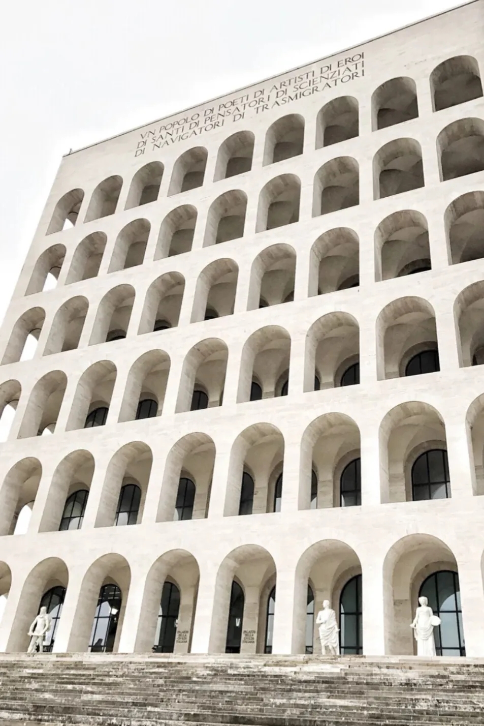 这座纪念碑建于20世纪四十年代,Palazzo della Civilta Italiana又名“方形角斗场”,2015年时时尚品牌 Fendi的总部设于此处。这座巨大的白色立方体建筑由六个等级组成,每个等级由九个拱门组成,一楼的拱门下放置着28尊1942年制作的雕像,代表着当时的艺术风格。
