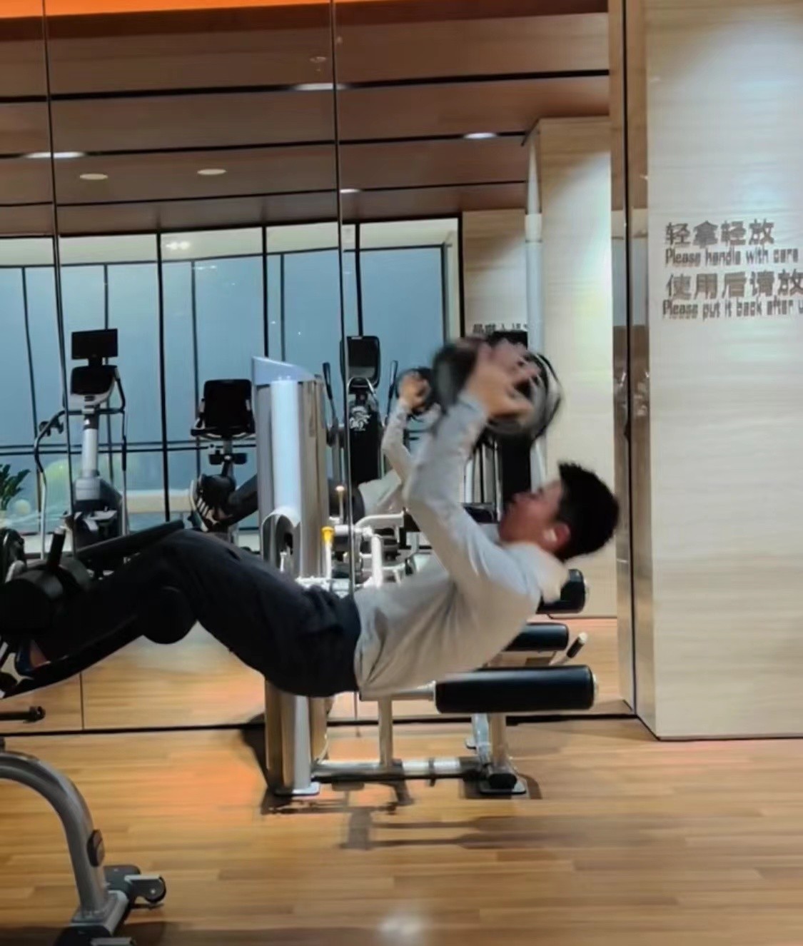 别看贾乃亮经常摔跤,但他在私下可是经常锻炼身体,时不时也会晒出自己在健身房里挥洒汗水的视频,只见他豪不费力地举起健身器材,做着健身的动作。