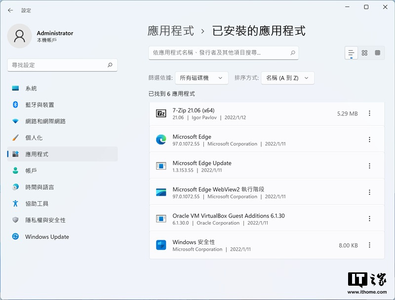 ▼ 已安装的应用(VirtualBox 附加件及 7z 是作者后期安装)