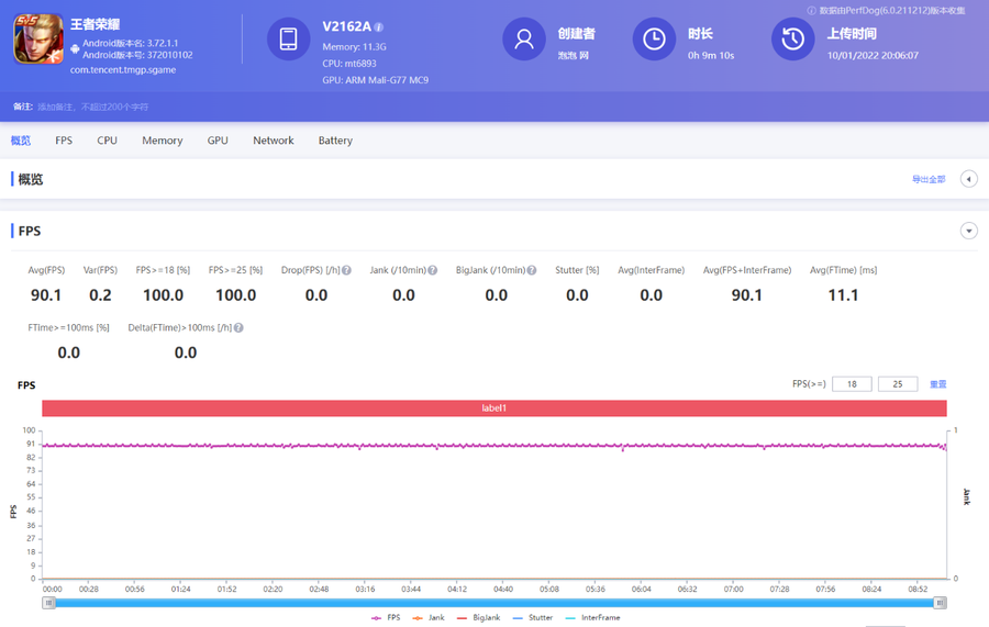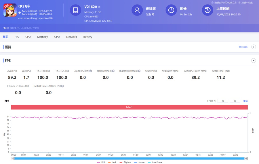 另外《QQ飞车》游戏也支持90帧模式,PerfDog软件记录到的平均帧数为89.2帧,同样可以提供流畅的高帧体验。游戏中各种操作响应也十分迅速,带来出色的高帧游戏体验。