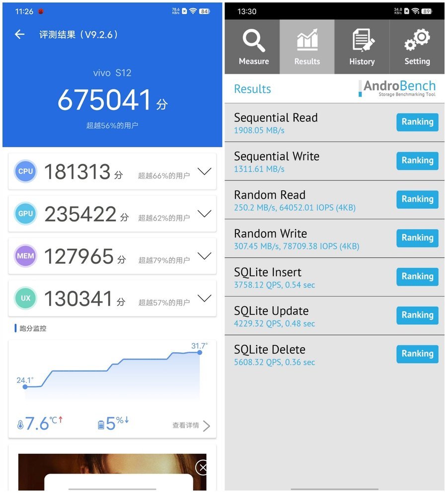 在跑分方面,vivo S12安兔兔综合跑分达到67万+,存储读写表现也十分出色,提升软件加载等场景的速度。实际游戏体验上,我们选取《王者荣耀》、《和平精英》、《QQ飞车》三款热门游戏进行实测。