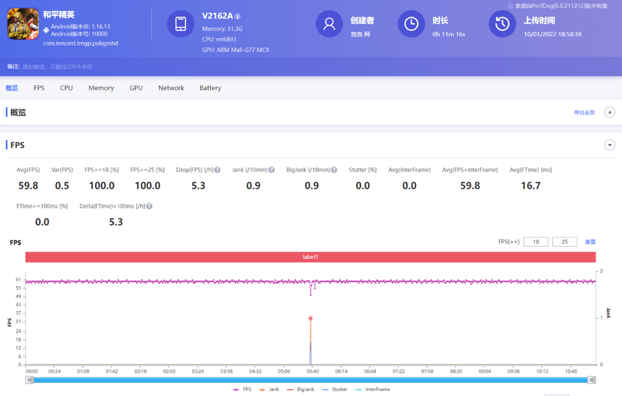 《王者荣耀》-PerfDog软件帧率测试结果△