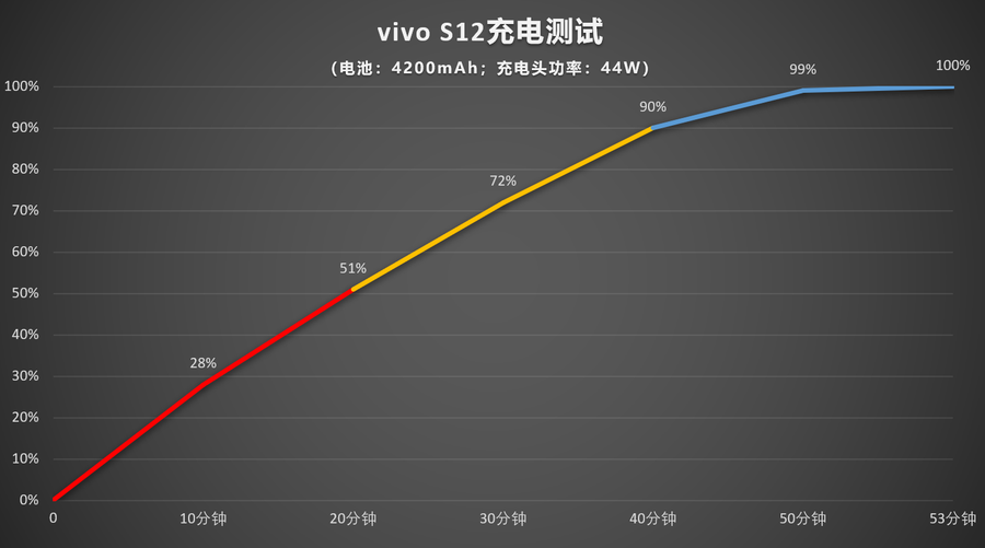 充电方面,手机电量耗尽自动关机后开始充电测试,10分钟就能达到28%的电量,30分钟达到72%的电量,达到100%电量用时53分钟。