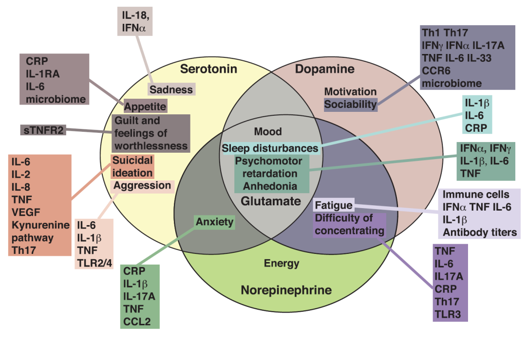 全身感染、癌症、自身免疫性疾病期间,促炎细胞因子 (IL-1,IL-6,TNF-α和IFN-γ 等)可引起行为症状,称为疾病行为,伴随着情绪低落、食欲障碍、睡眠障碍、心理运动障碍、疲劳、能量丧失、思维或集中困难。这些研究表明细胞因子在情绪障碍和行为功能障碍中起着关键作用。