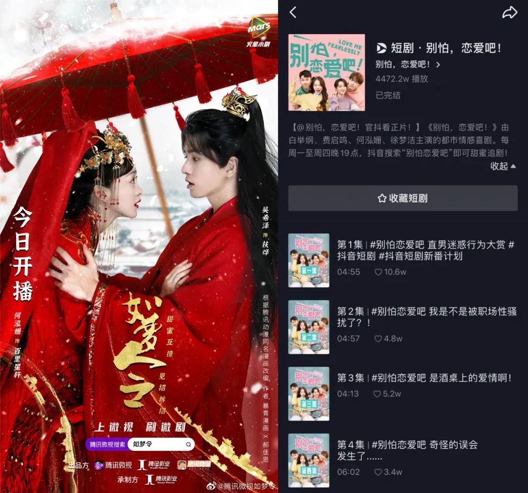 长视频平台惯用的“明星效应”,在草根达人占据主流声浪的短视频平台收效甚微。以何泓姗为例,其主演《如梦令》在腾讯视频拿到年度播放量榜首,与白举纲等合作出演的《别怕,恋爱吧!》仅在抖音站内收获4000W+播放量。