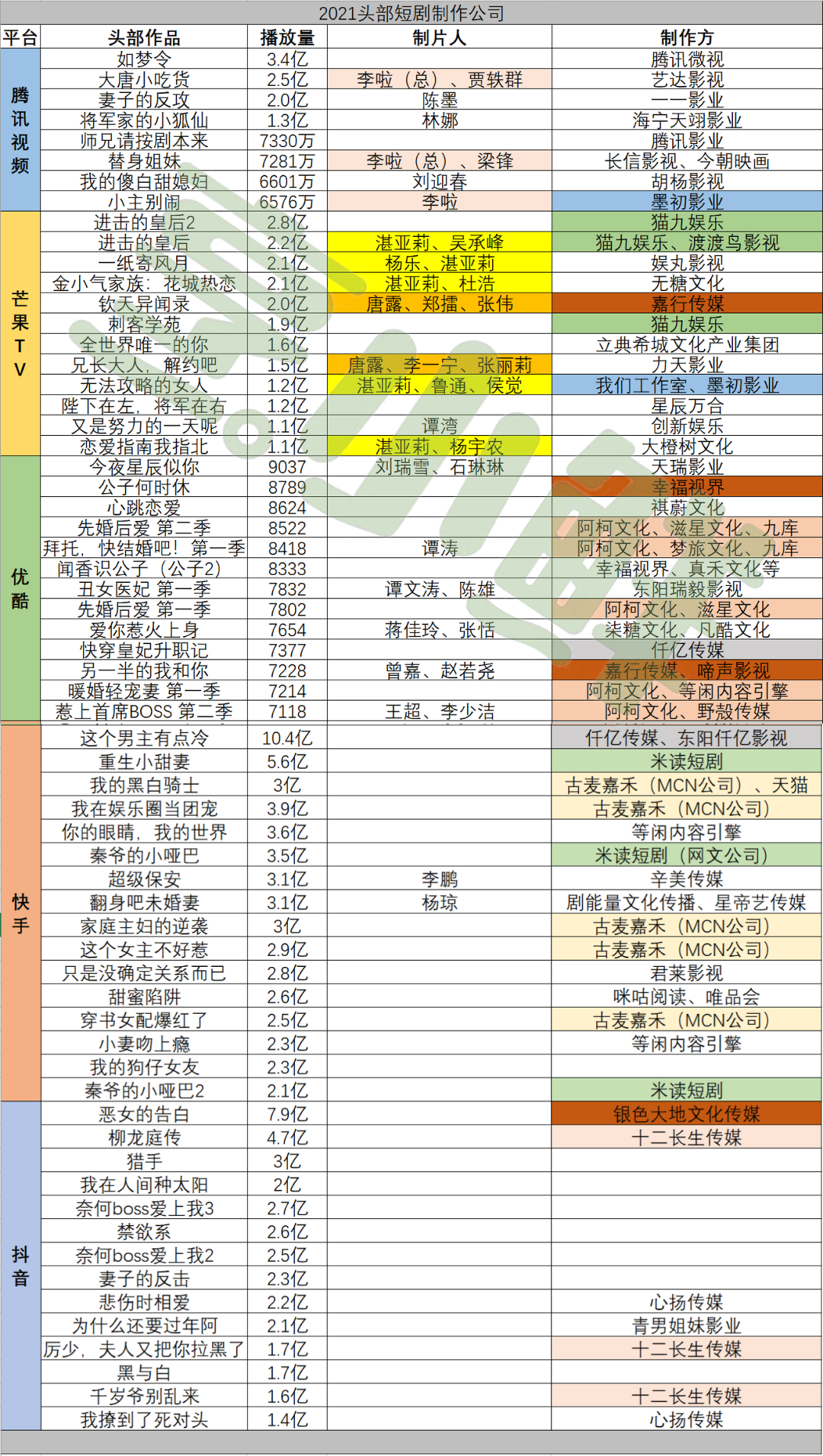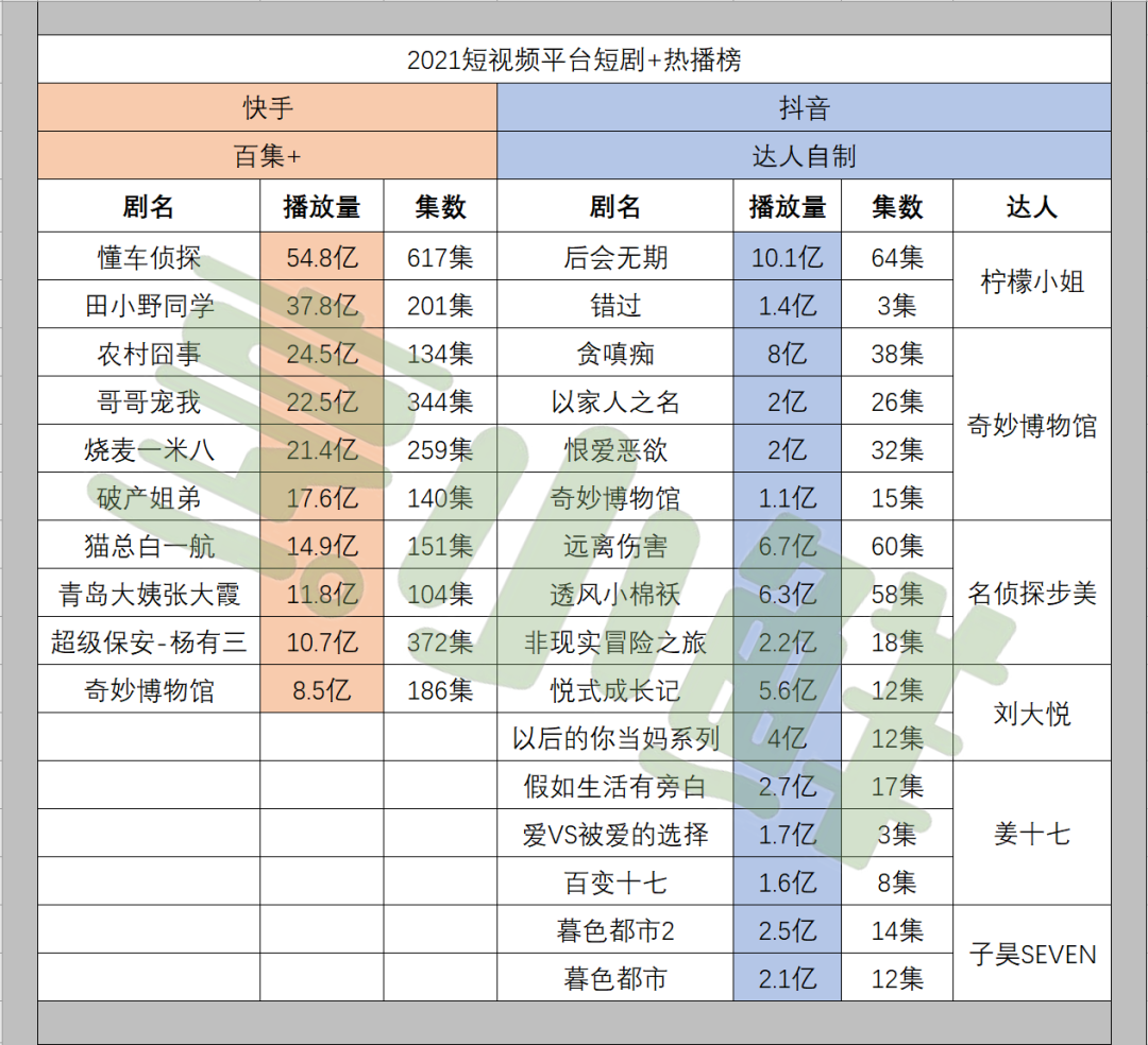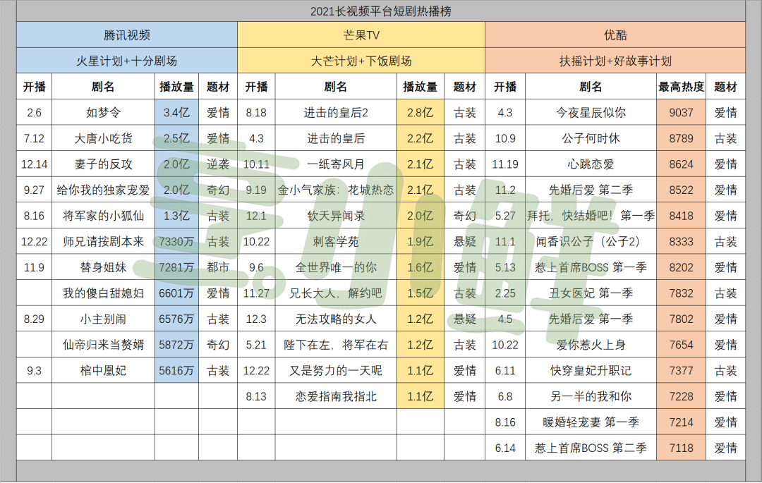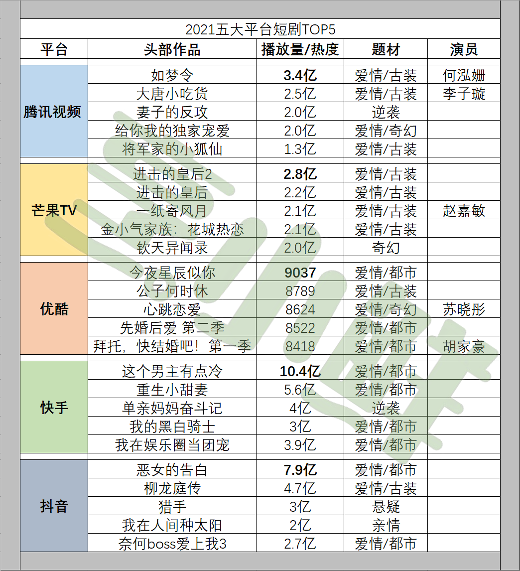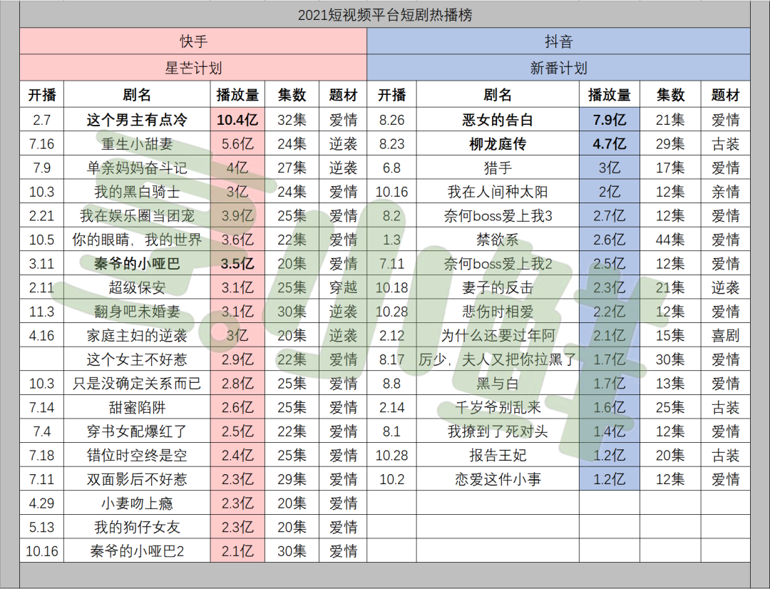 烹小鲜(pengxx01)统计五大平台2021年度头部热播微短剧,对比播放数据、内容题材、制作方、平台规划等,试图分析一二。