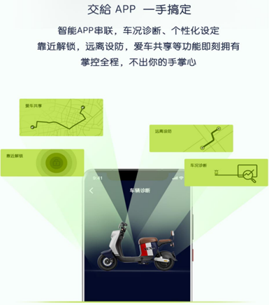 再看电动车配套的APP,手机一键操作就能享受到很多“保姆级”服务。像是手机靠近电动车即刻感应解锁,人车分离自动落锁设防,远程查看剩余电量、剩余续航里程等车辆实时状态,还有车况健康诊断,车辆异常报警等诸多功能都可以在APP里一手搞定,妙趣横生的智慧出行体验感爆棚。