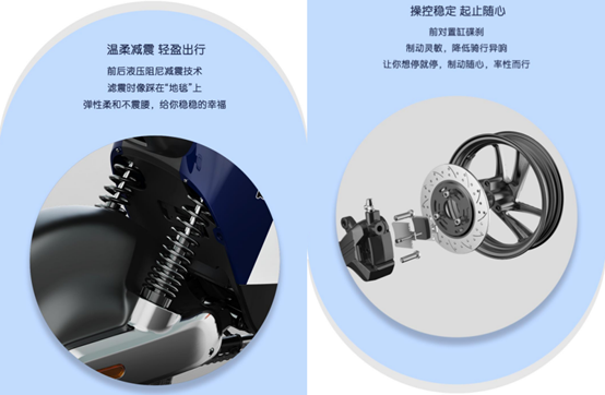 就连车辆配置也很有讲究,人体工学的鞍座座椅采用了高回弹、耐压陷的沙发级海绵面料,坐感舒适柔软;车辆还使用了前后液压阻尼减震技术,有效过滤震感,骑车经过减速带也不颠簸;更有超静音对置缸碟刹,制动灵敏,急刹时都不会发出刺耳的响声。