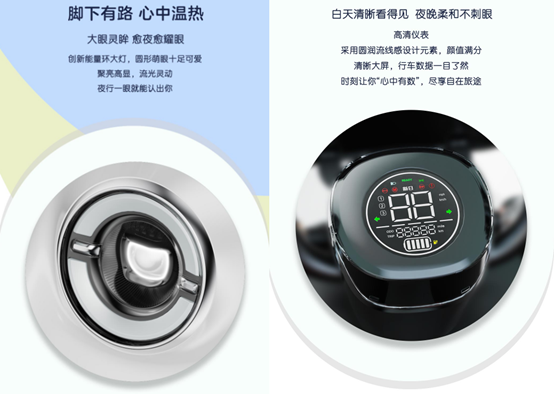 车身的灯光和仪表设计既清亮又灵动。LED高亮透镜大灯,高光聚亮、穿透力强,夜间出行没有路灯的也能轻松照退黑暗。仪表盘则采用了高清液晶彩屏,流光灵动间,集成化显示的行车数据一目了然,白天清晰看得见,夜晚柔和不伤眼。车辆整体给人留下的第一印象就很赞!