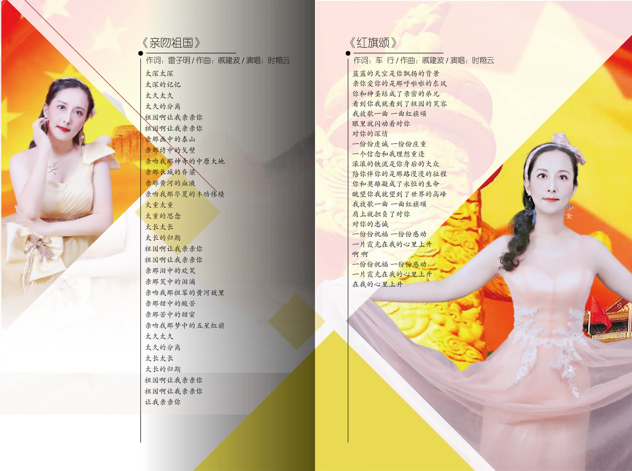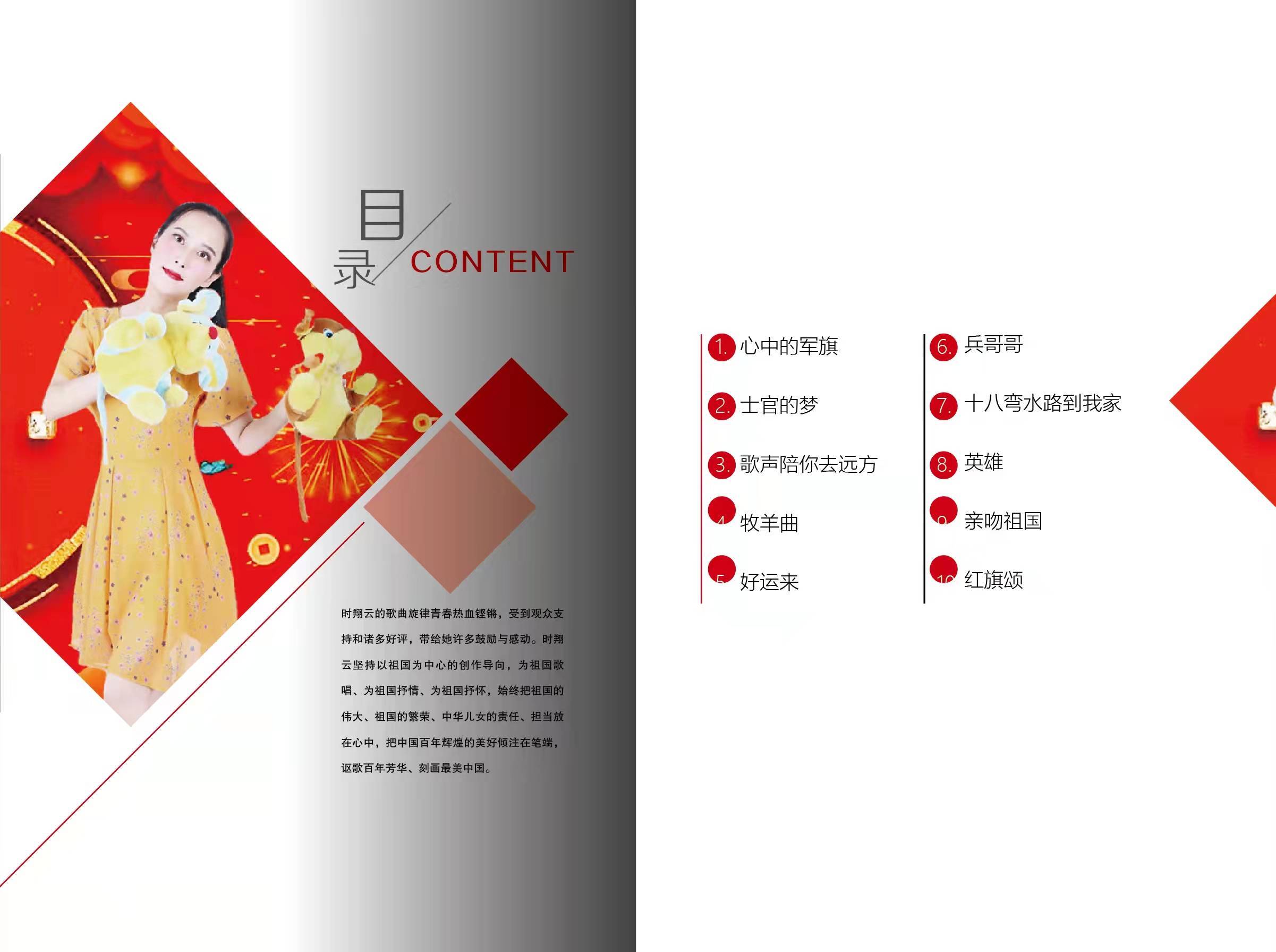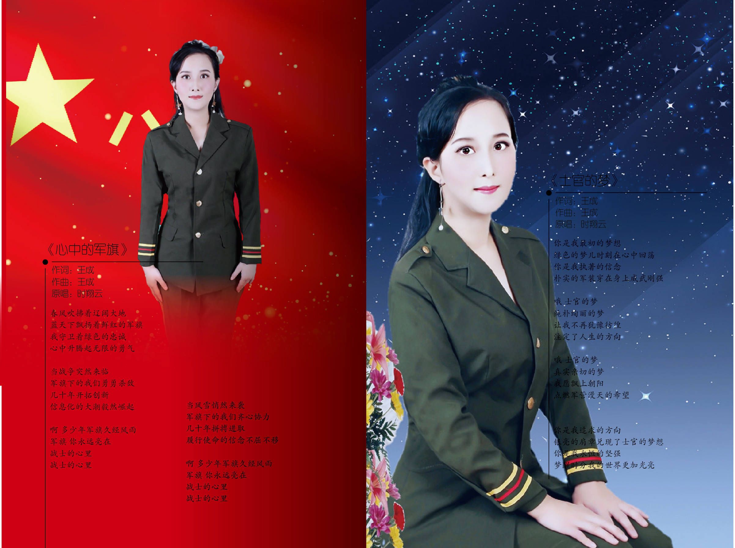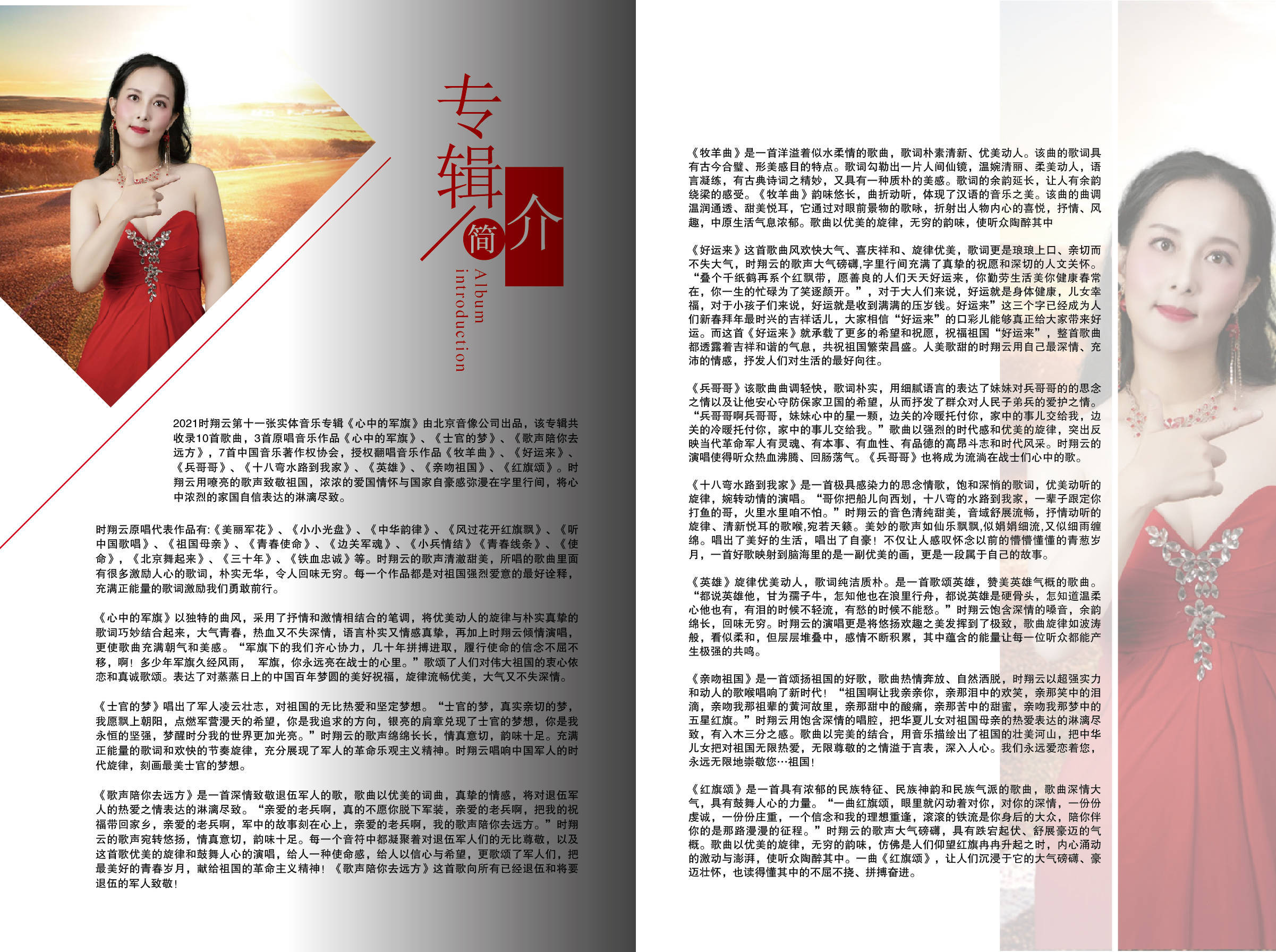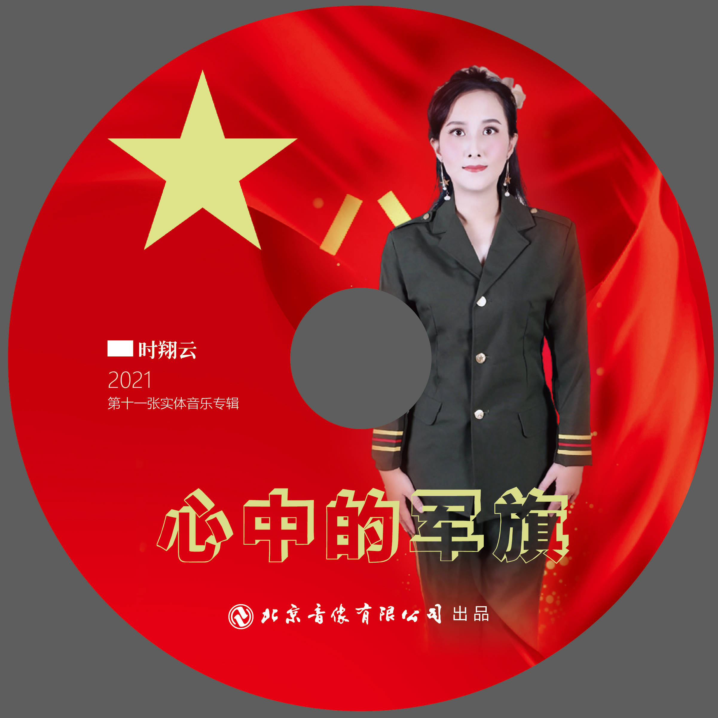 2021时翔云第十一张实体音乐专辑《心中的军旗》由北京音像公司出品,该专辑共收录10首歌曲,3首原唱音乐作品《心中的军旗》、《士官的梦》、《歌声陪你去远方》,7首中国音乐著作权协会,授权翻唱音乐作品《牧羊曲》、《好运来》、《兵哥哥》、《十八弯水路到我家》、《英雄》、《亲吻祖国》、《红旗颂》。时翔云用嘹亮的歌声致敬祖国,浓浓的爱国情怀与国家自豪感弥漫在字里行间,将心中浓烈的家国自信表达的淋漓尽致。