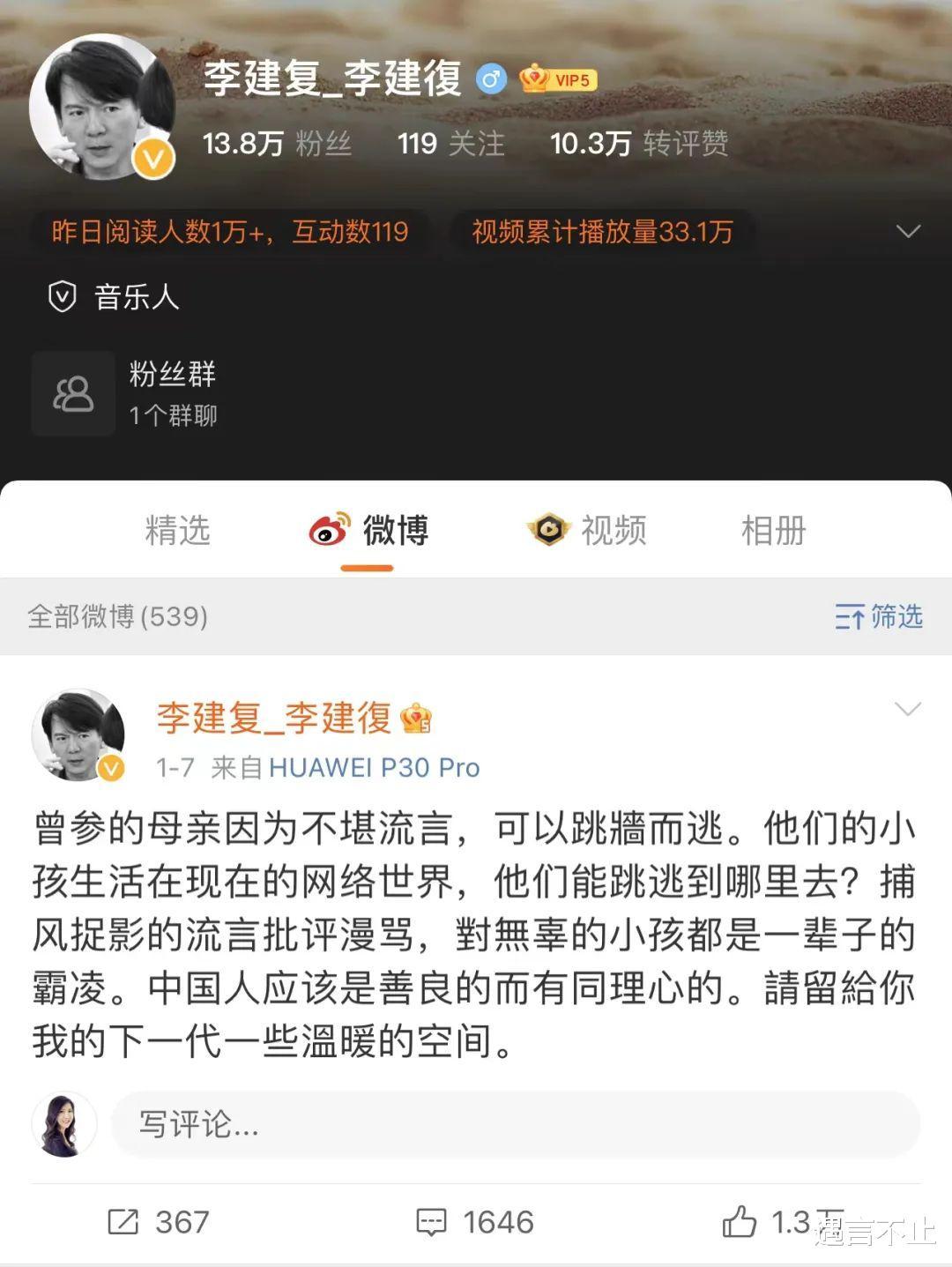 除了王爸爸下场之后,王力宏的表叔李建复(据说是《龙的传人》的原唱者)也发文,暗指李靓蕾“捕风捉影”,制造“流言”。