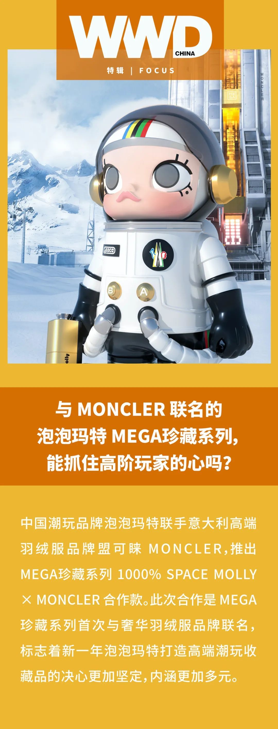 如果说与「海绵宝宝」这类经典动漫角色的跨界为 SPACE MOLLY 增加了更多趣味丰富的新元素;与著名艺术家合作是对 MOLLY 这个经典 IP 形象进行了新文化力量的重塑,那么与 MONCLER 的合作则是更加奠定了 MEGA珍藏系列“稀缺”、“高端”、“值得珍藏”的特质。