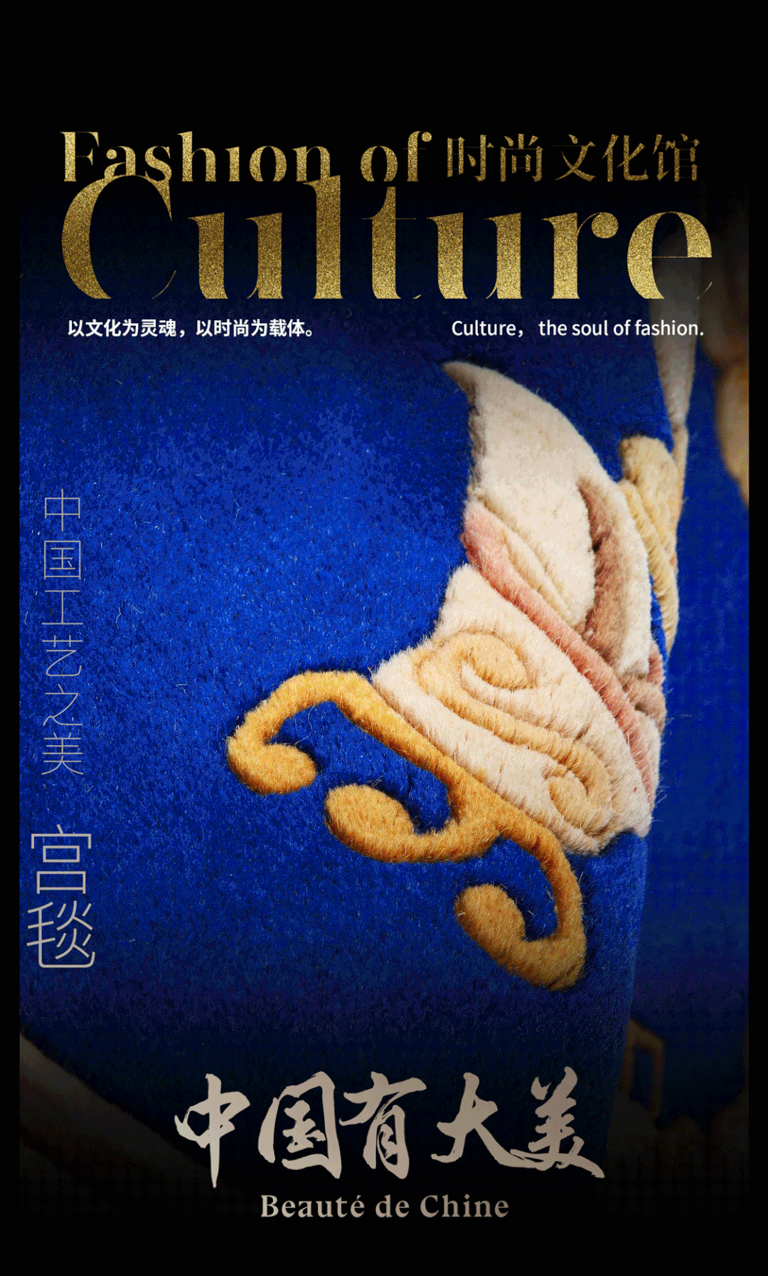 “南北一条中轴线,四方对称布局严,外城内城加皇城,城城围着紫禁城。”宫毯 的格式布局很像这句形容故宫的顺口溜,宫毯是一种富有北京地域特色和宫廷特色的手工艺制品,起源于宁夏,因其织结坚牢、毯面柔软而深得皇家的青睐,自元代起就开始成为皇宫的御用品,由此而得名。明清时期,故宫殿宇的地面,大多覆盖着厚重的地毯,图案精致华丽,由官营作坊织造,被称为官坊毯。如今的北京宫毯织造技艺便直接继承自当年的官坊毯织造。北京宫毯融中国绘画、刺绣、织锦、建筑装饰等艺术于一体,于经纬之间诠释出宫廷艺术的魅力。2010 年, 北京宫毯织造技艺被列入国家级非物质文化遗产名录。