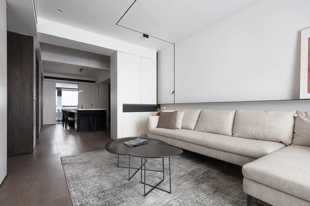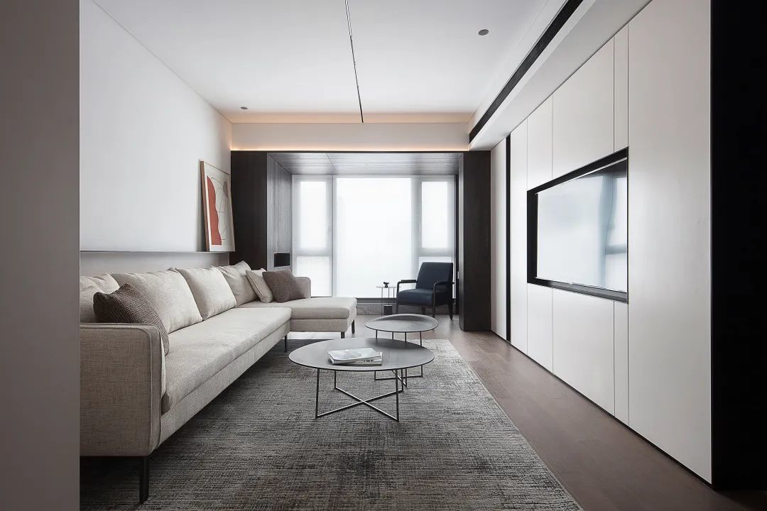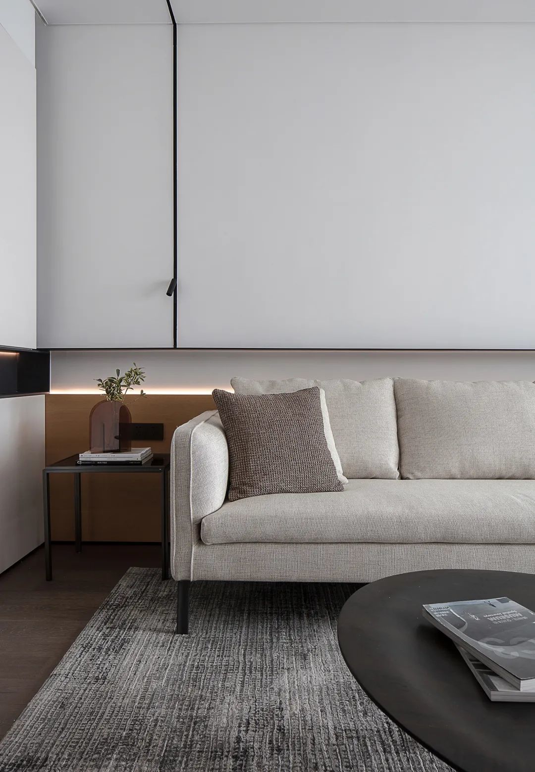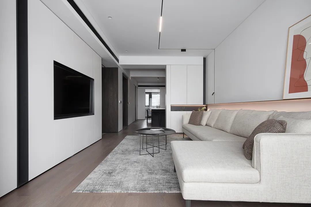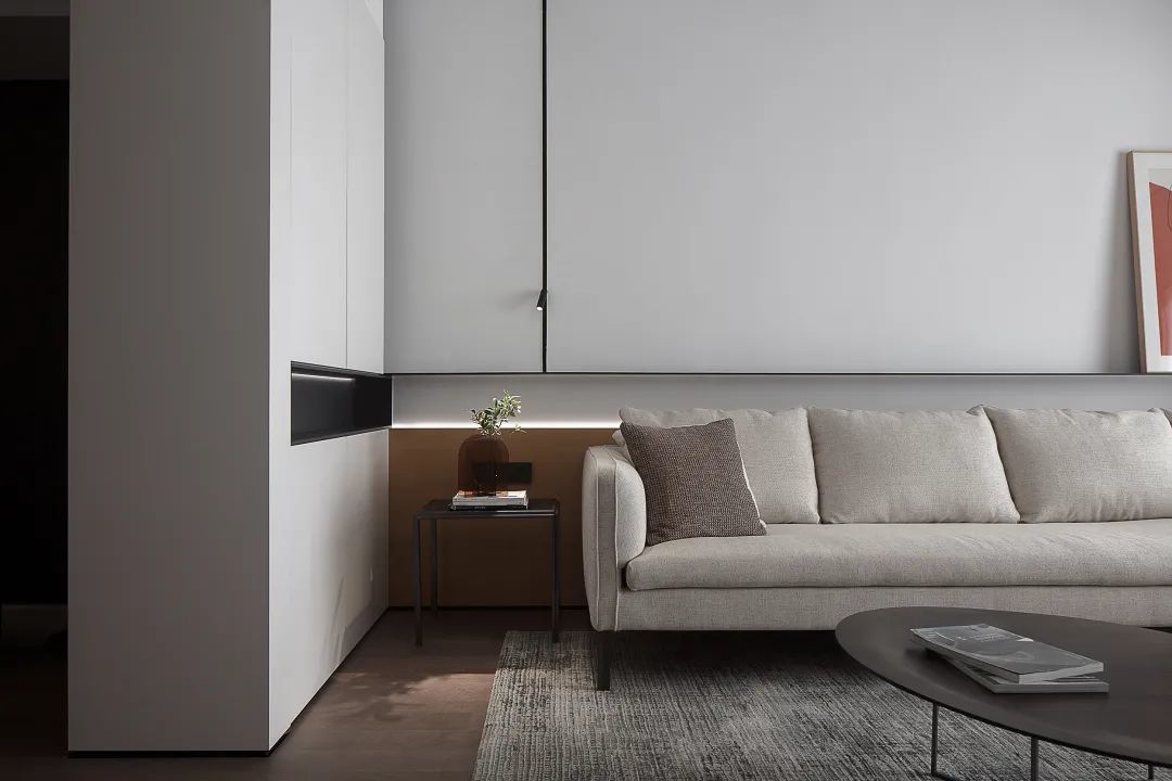 ▲沙发墙墙脚区域以木饰面保护,并加入暗藏灯带的设计,增添了空间的层次与温馨气息;布置浅灰色布艺沙发,还有极简的深灰色岩板茶几,也让空间显得更加年轻高级。