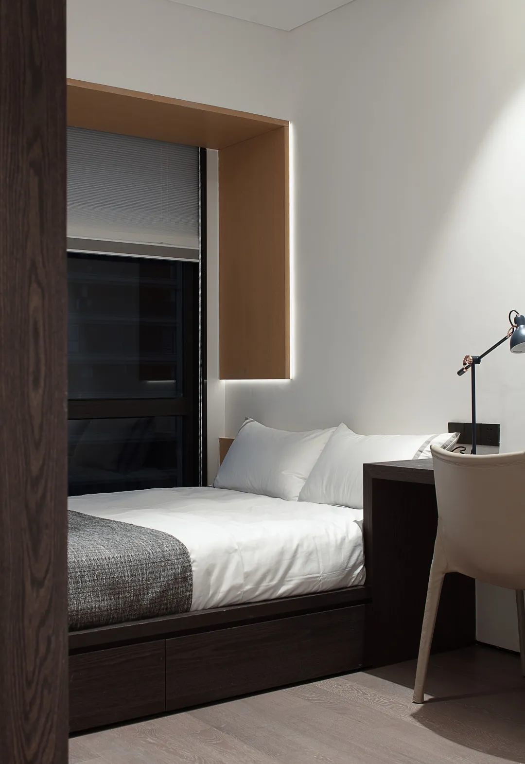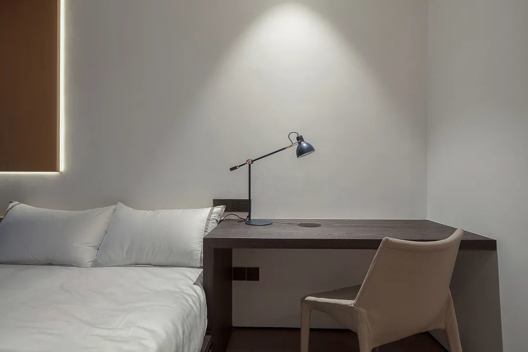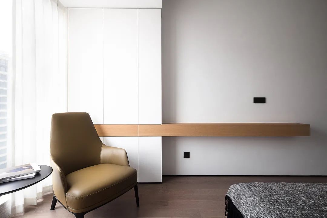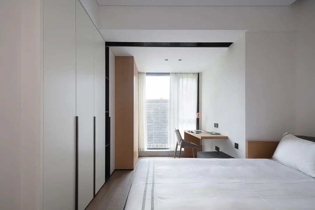 ▲次卧整个空间简约现代为主,洁净的白色墙面与床单,床尾一整排的定制衣柜,整个空间简单舒适;在靠窗位置定制一张书桌,也提供了阅读工作加班的惬意位置。