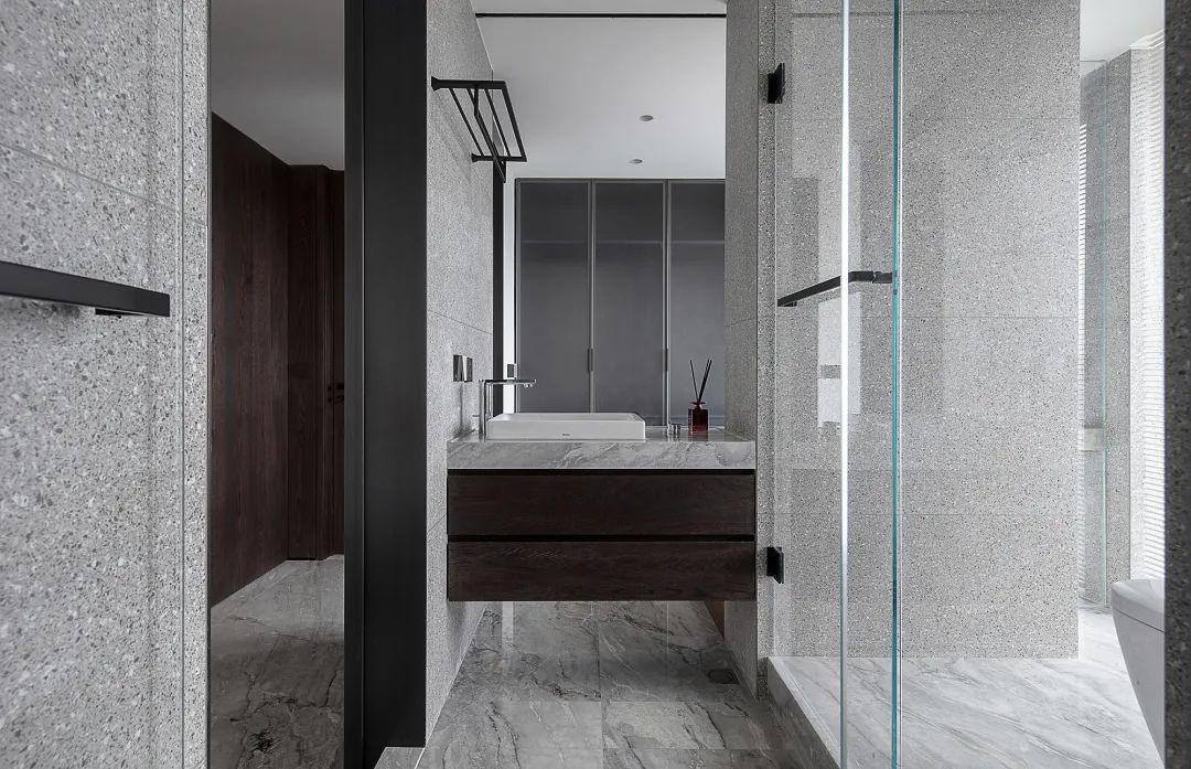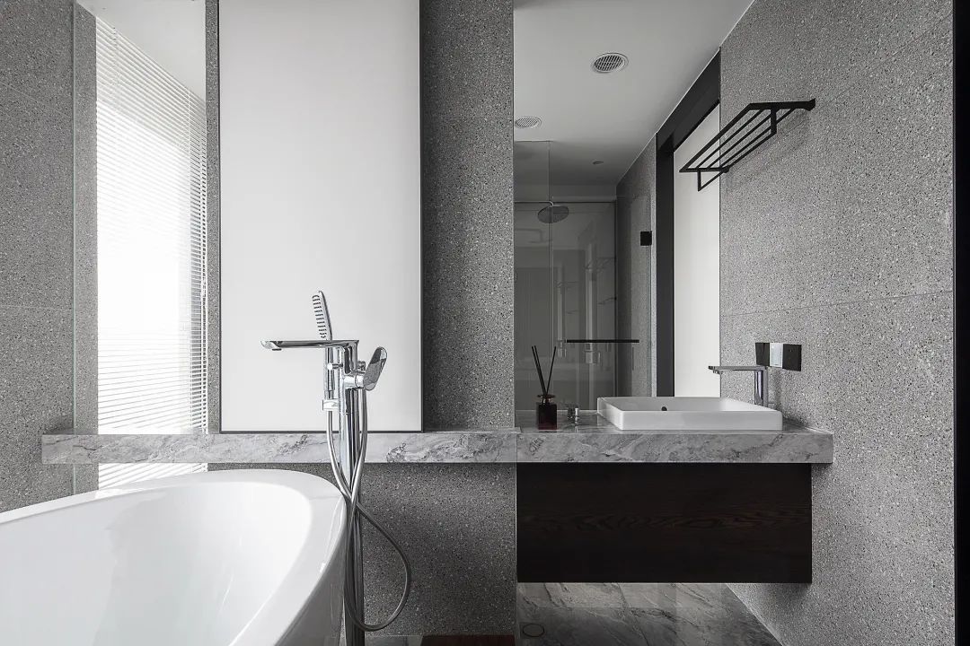 ▲卫生间以灰色大理石质感的地面砖,墙砖则是采取水磨石质感的设计,整体现代时尚的材质与设计,为主人营造出了一个实用轻松而卫浴功能。