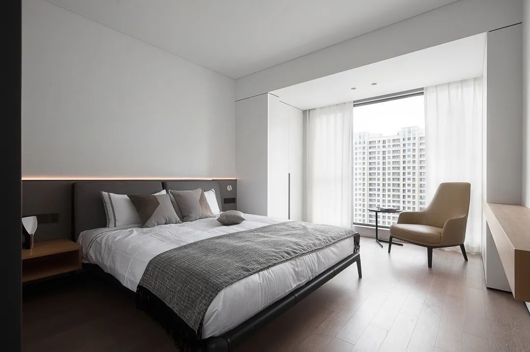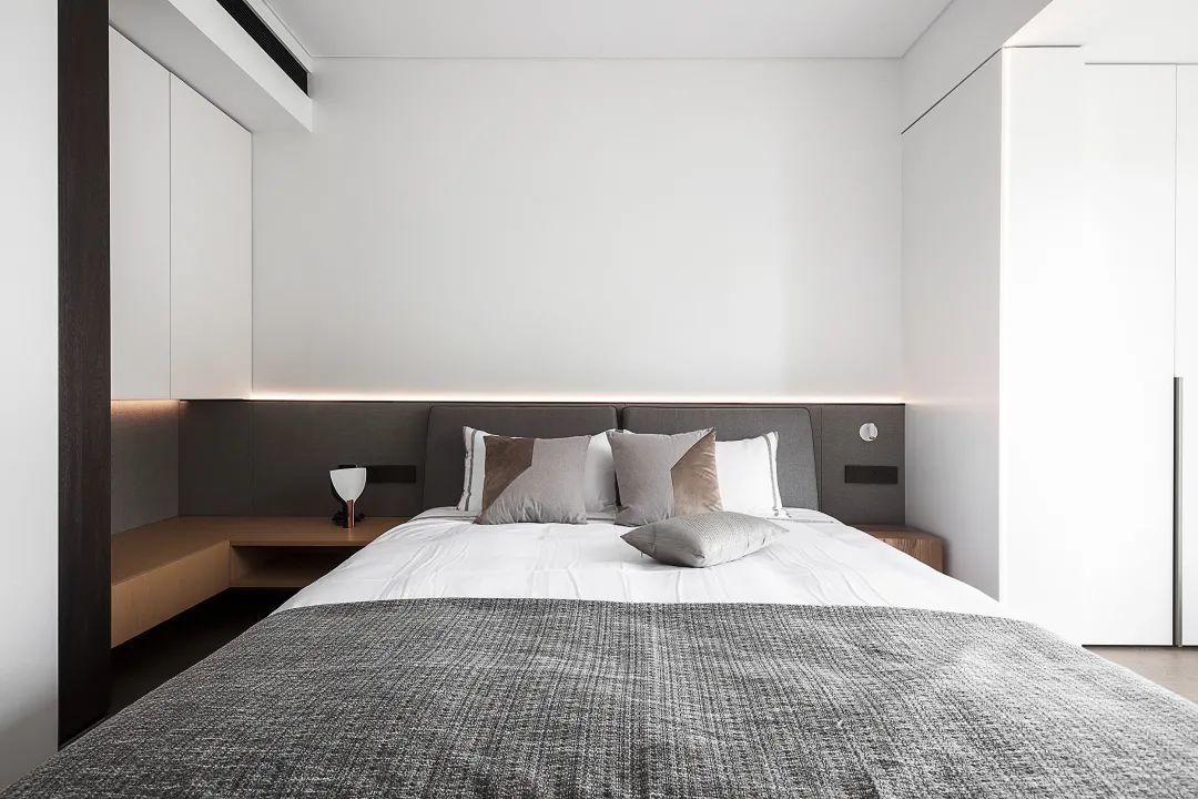 ▲卧室空间也是以极简大方为主,净白的墙面天花,搭配灰白配的床单,呈现出一种简约舒适的高级与大方感;床头墙灰色的墙脚,布置灰色床铺,也显得更加简约自然。