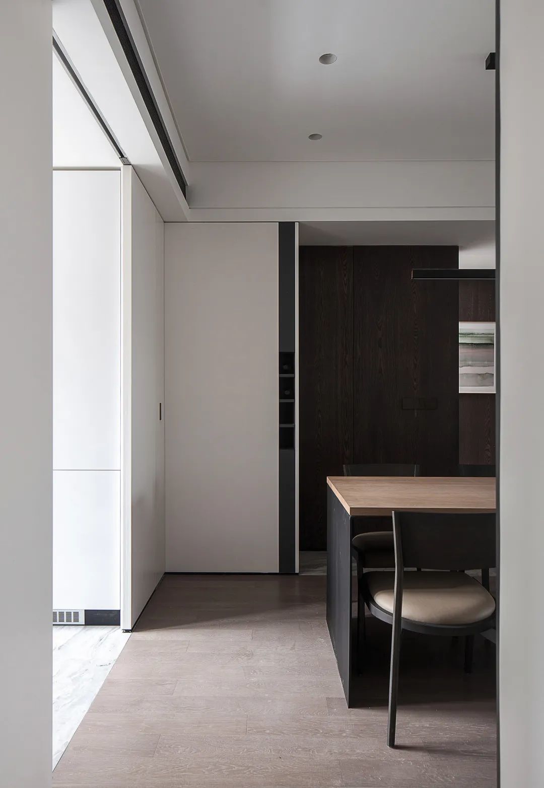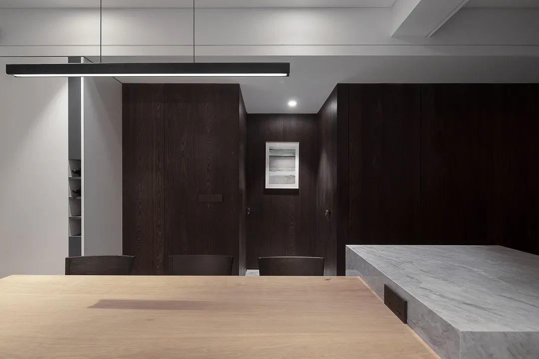 ▲餐厅后方的墙面与过道,都采取深木色的木饰面为装饰,在现代简洁的空间下,显得更加有品质感。