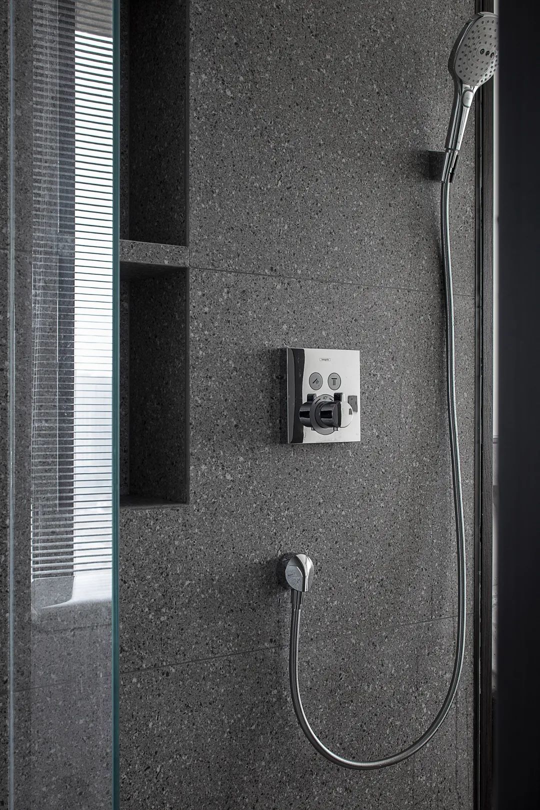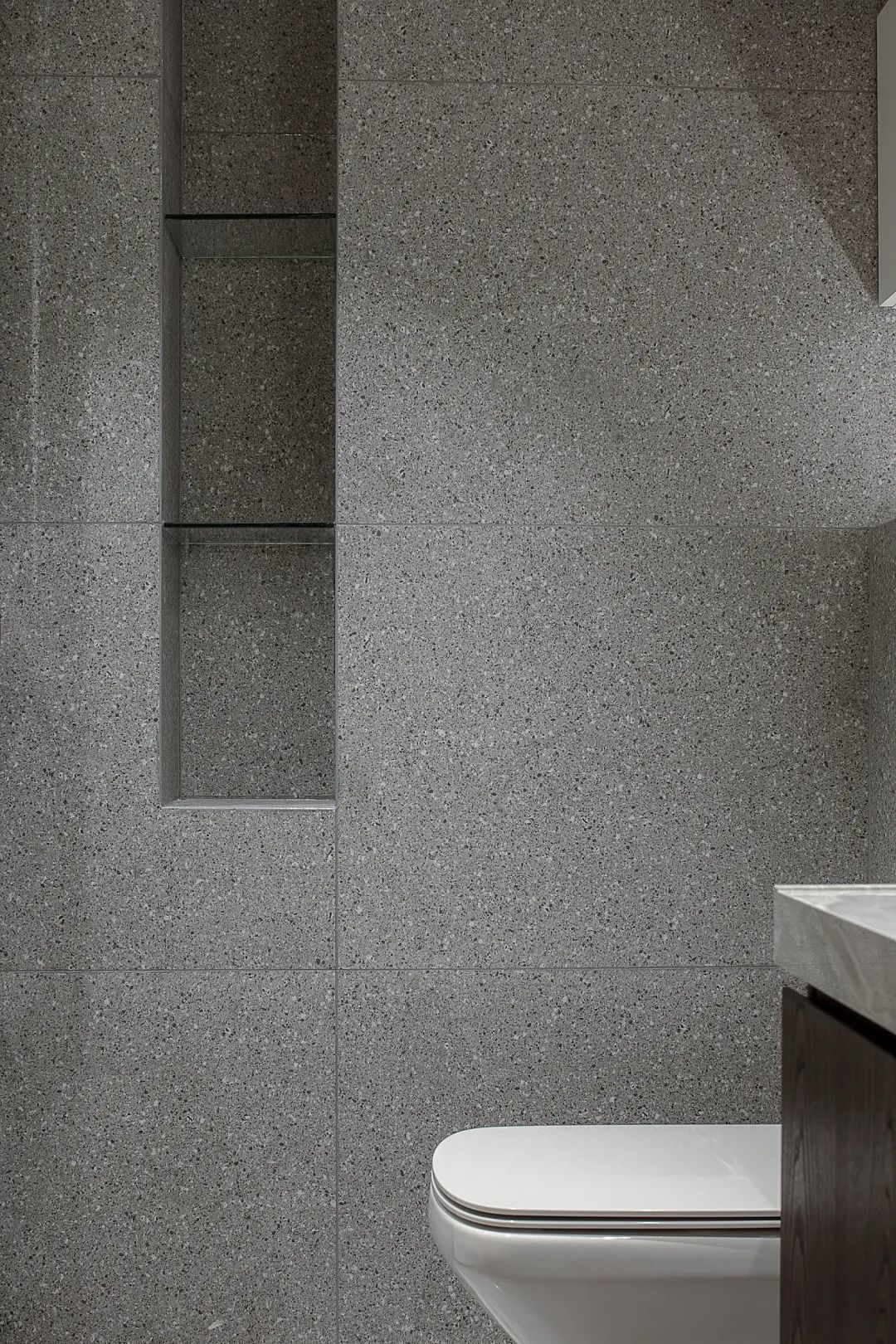 ▲在水磨石墙面的基础,在淋浴房与马桶旁边都加入了壁龛的设计,让卫浴功能更加实用方便。