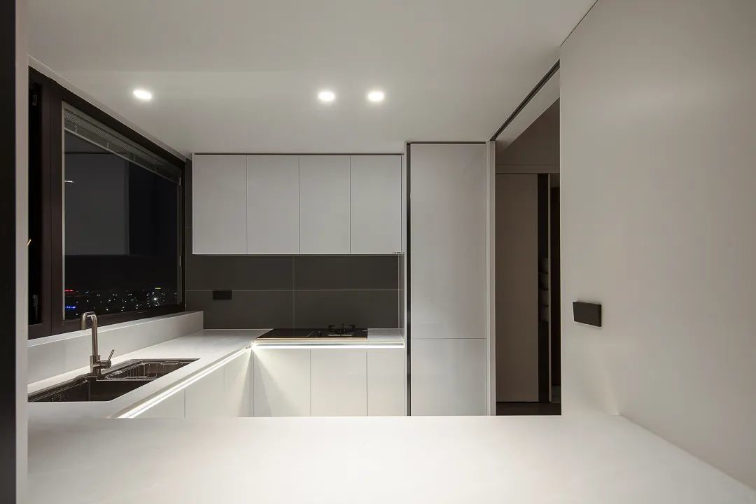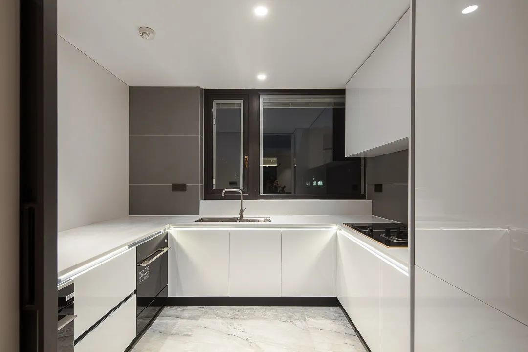 ▲厨房以雅白色的地砖,橱柜吊柜与操作台也是简洁的白色,靠窗侧的墙面贴着灰色墙砖,在U字形的操作台空间下,提供了一个轻松实用的烹饪空间体验。