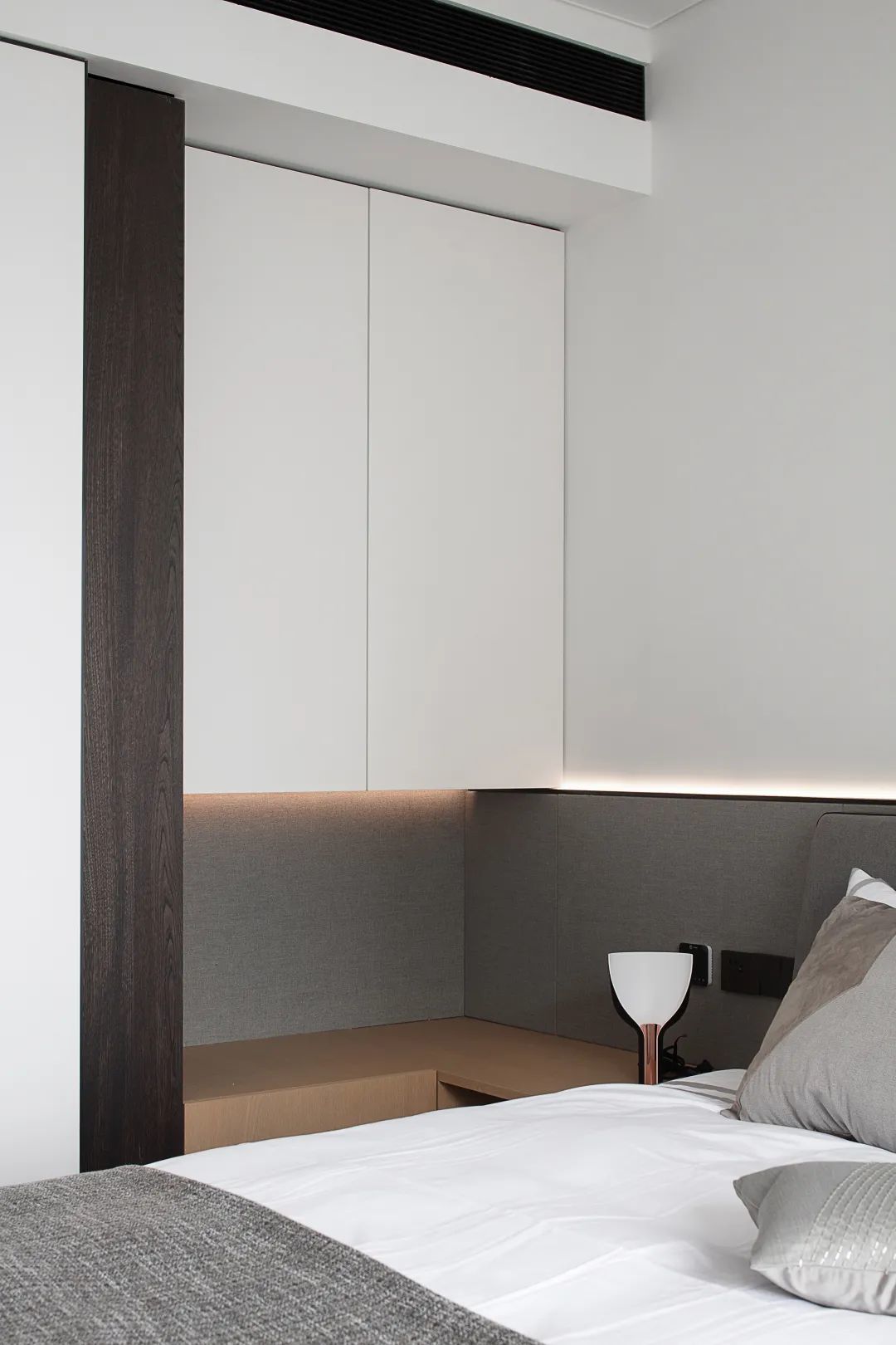 ▲床头柜采取定制式的设计,与衣柜做成一体的拐角设计,并在边角位置暗藏灯带,让空间更加温馨有层次感。