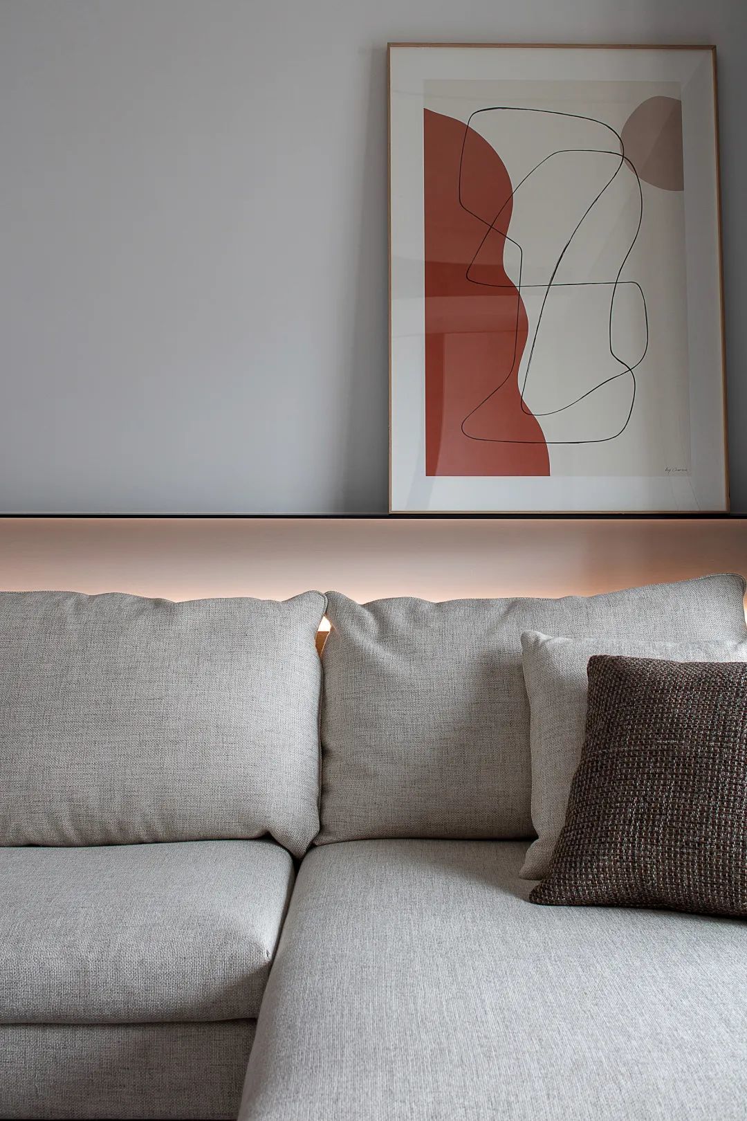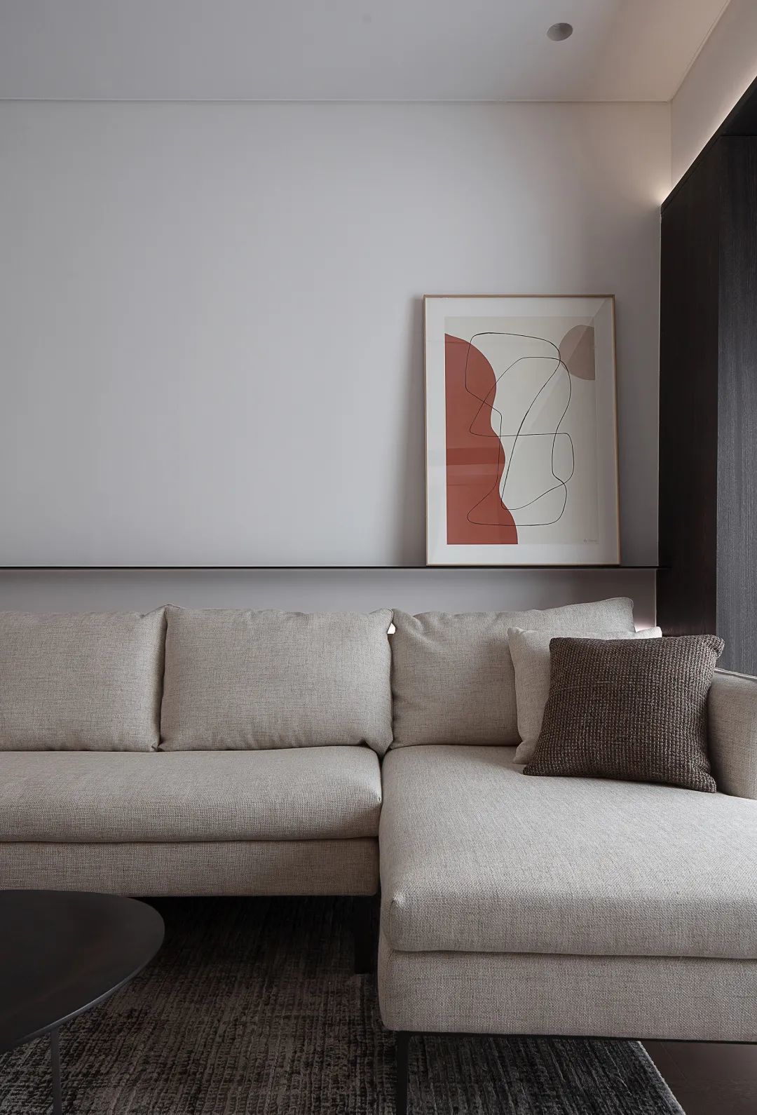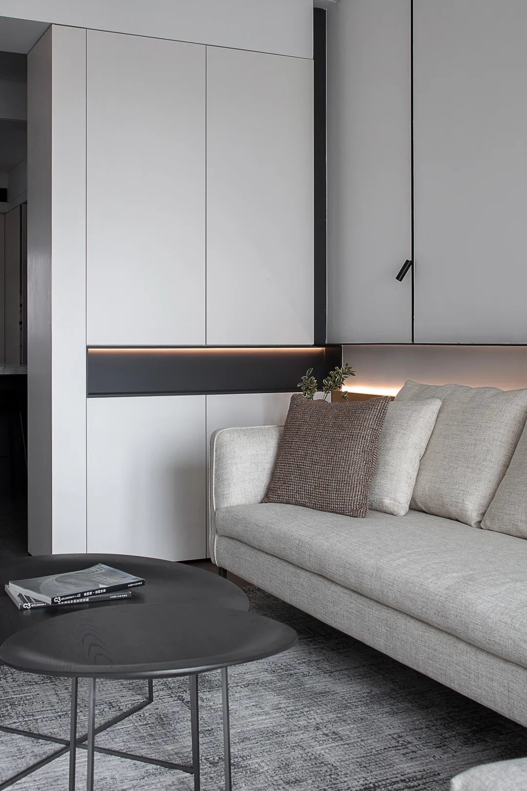 ▲沙发旁边是一个定制柜,柜体中间还加入了一层黑色的空间,结合暗藏灯带的衬托,呈现出一种时尚高级而温馨的角落效果。