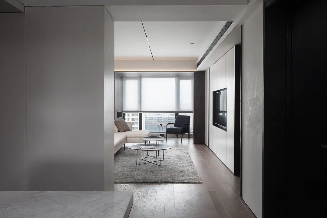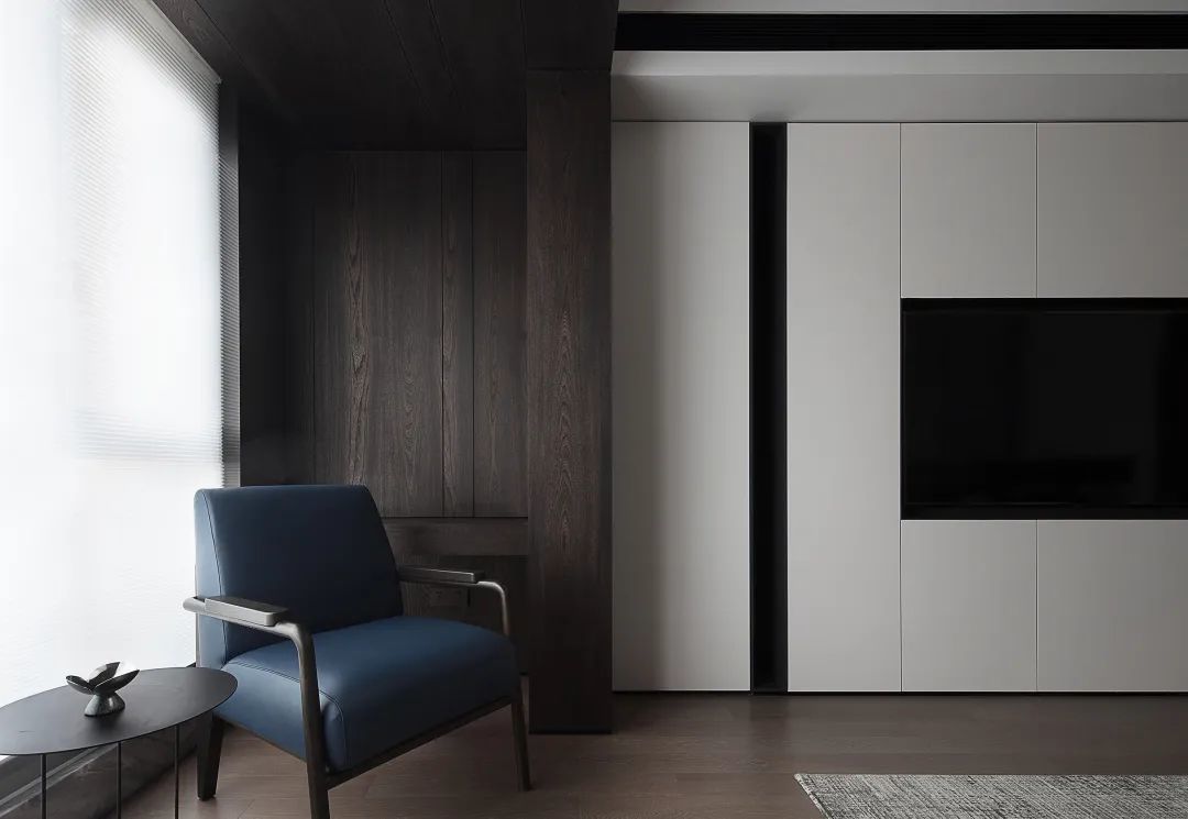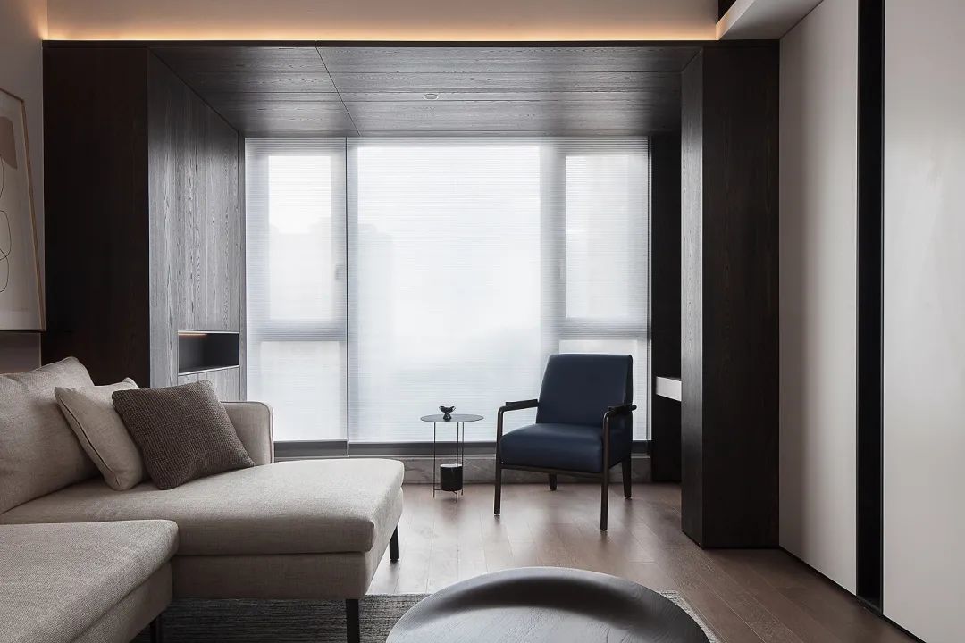 ▲打通后的阳台纳入客厅,在深木色的木饰面墙面与天花基础,侧边还定制了一个收纳柜,窗户采取半透卷帘设计,呈现出一种简约舒适而自然的氛围。