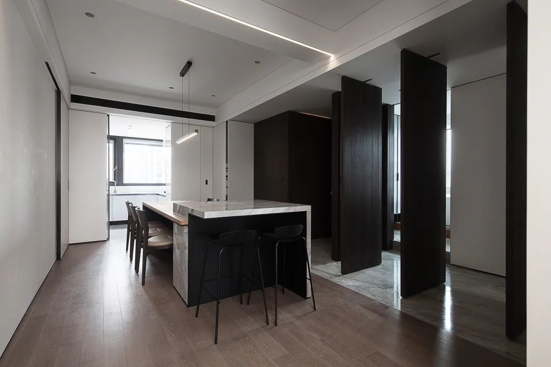 ▲餐桌挨着中岛台,布置上黑色吧椅,旁边深木色的转轴门,呈现出一种稳重端庄的高级感;天花横梁做了一个造型加入线条灯带,也起到了巧妙的装饰作用。