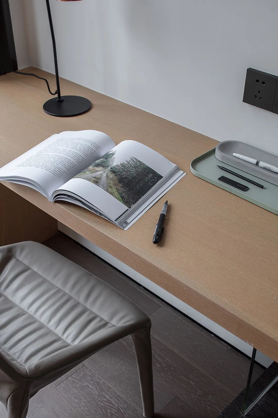 ▲木质的定制书桌,搭配灰色皮艺椅子提供了一个简约舒适的书桌。