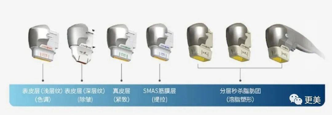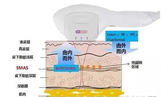 超声刀利用聚焦超声波,以点的形式作用到皮下,损伤皮下细胞,引发肌体启动修复再生细胞及修复 SMAS 筋膜的功能,起到提升、除皱的效果。
