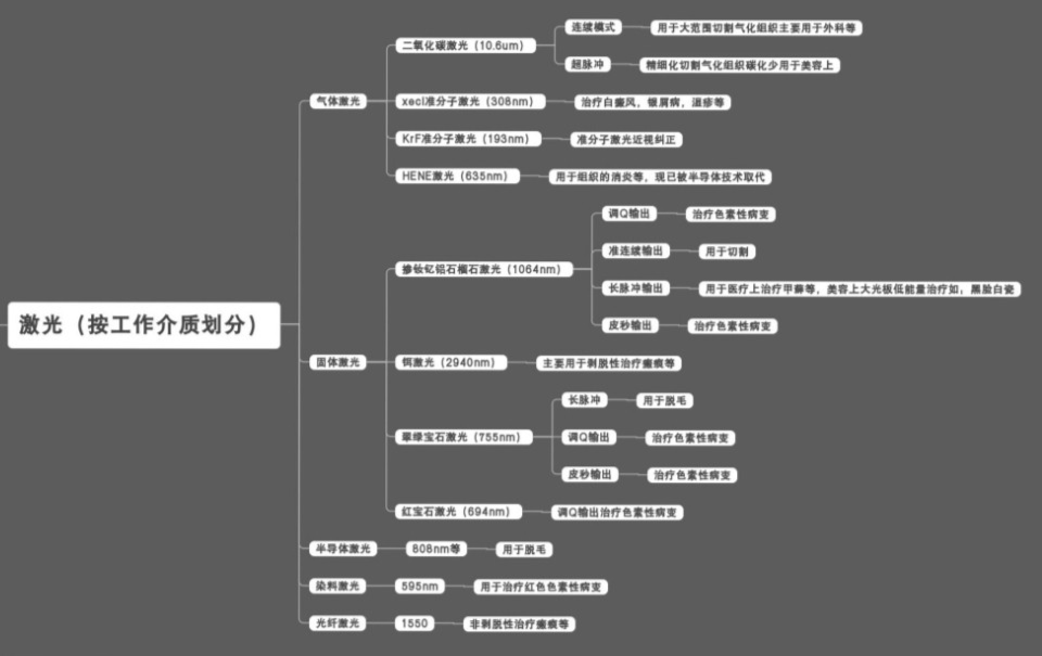激光属于医美中发展很久的一个大类,其下又可以按不同的性质进行各种各样的分类。