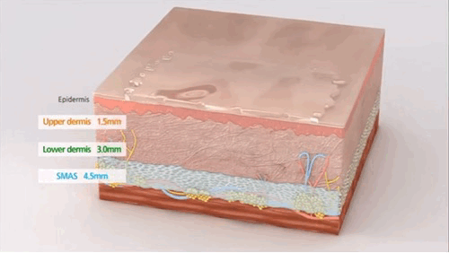 从表皮层深入到真皮,皮下脂肪层,再到SMAS层,4D能够逐层的对脸部进行治疗,在抗衰除皱的同时,还能够兼顾皮肤管理。