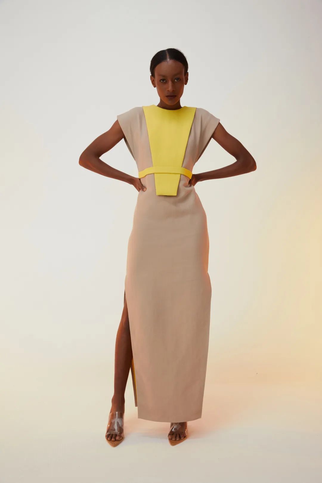 在2021年10月举办的2022SS上海时装周上,TU的时装周首秀呈现了以“即兴几何”为主题的设计系列成衣,惊艳四座。设计师从抽象派美学大师康定斯基的作品中,领悟美感、攫取灵感。将大师画作中和谐的色块,简洁的线条,尚可解读的寓意,为世人所称道的、强烈而统一的艺术风格,与现代时尚融合、碰撞,开出一朵不一样的花。“特别是那幅著名的《黄·红·蓝》,那幅将抒情与几何完美融合的大成之作,让我在画前停留久久不舍离去。”李芬芬与我们分享道。于是,她用一袭袭色彩明亮柔和、剪裁别具一格的霓裳去表达她彼时的感动与思索,以期给受众一季富于艺术激情的春夏成衣。