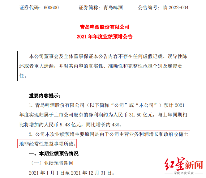 不过,青岛啤酒的业绩只是表面好看。红星资本局拆解业绩构成发现,其业绩大增的主要原因包括:一是公司2021年主营业务利润增长,与上年同期相比增加约3.79亿元;二是政府收储土地的非经常性损益,将增加净利润近5亿元。这意味着青岛啤酒的利润增量中,依靠“卖地”带来的贡献更多。