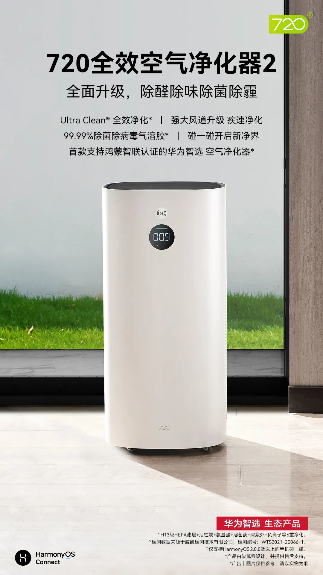华为智选 720 全效空气净化器 2 采用 UltraClean 全效净化 — 内外一体 6 重循环净化,真正实现除醛、除菌、除霾、除味、除毒气溶胶。