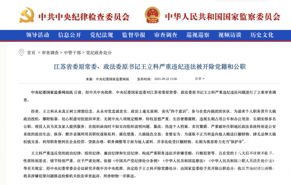 2021年9月22日,中央纪委国家监委发布消息:经中共中央批准,中央纪委国家监委对江苏省委原常委、政法委原书记王立科严重违纪违法问题进行立案审查调查。