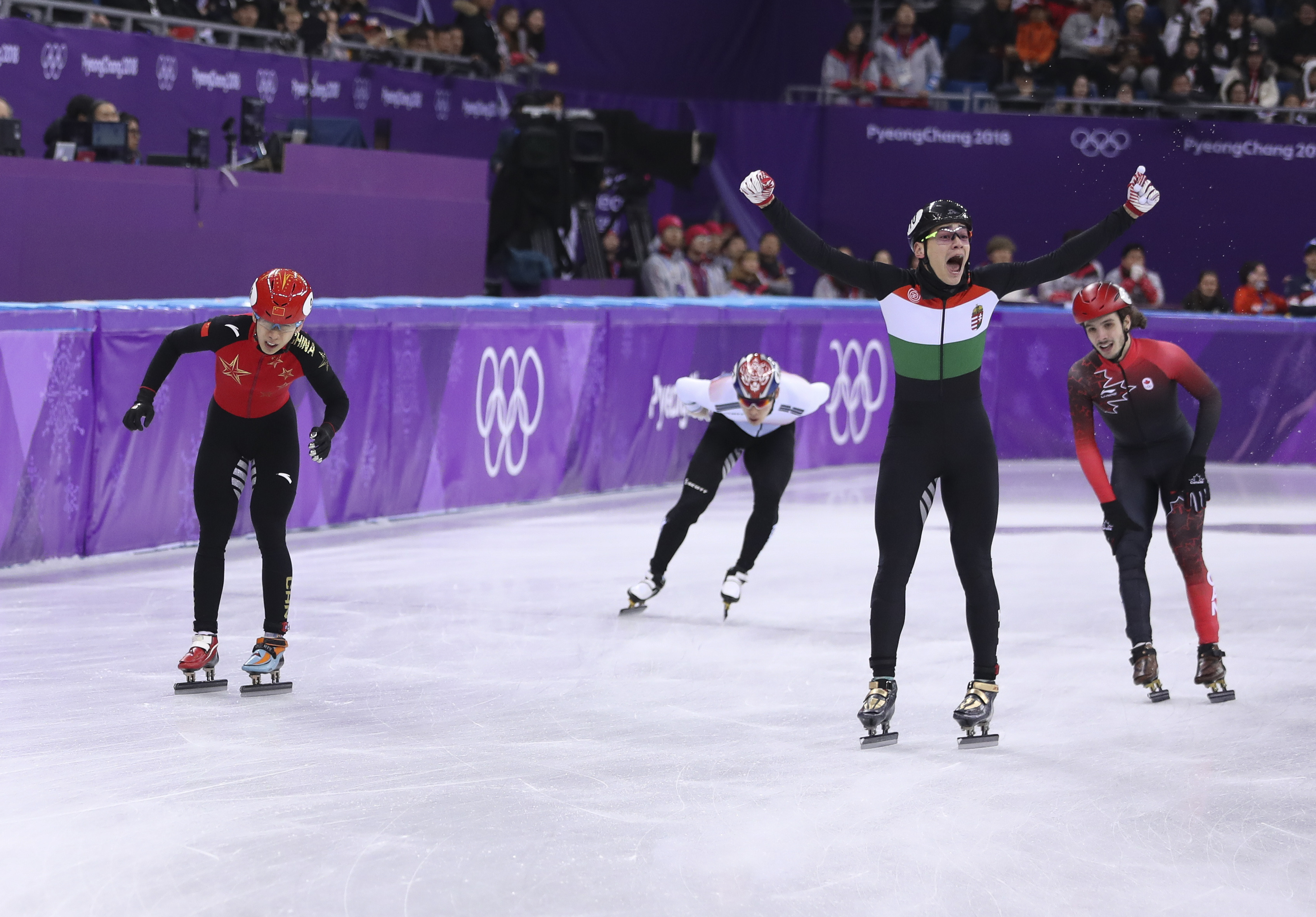 图为2018年2月22日,匈牙利队选手刘少林(右二)在比赛中冲过终点后庆祝。 新华社记者韩岩摄