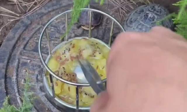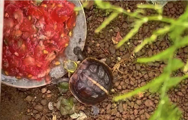 三、固定食材,定时,定质,定量,定温,保证食材鲜活,灵活运用食物诱导法。龟友小伙伴们都知道,乌龟是冷血动物,也是变温动物,随着外界的自然温度的变化体温也会随之变化,所以黄缘闭壳龟喂食,时间选择很重要。中国之大,一城一温,一年四季,四季不同、春生秋杀,夏长冬消。每一城,每一季,都不同,夏天高温要防暑,冬天大雪飘落要防冻,黄缘闭壳龟的饲养进食合适温度是28-32度,在这个温度下黄缘闭壳龟的活跃度和食欲相对旺盛,这个温度喂食和驯化是最合适不过的了,非常有利于龟龟的进食、消化和成长,这个温度下喂食肠道疾病发生的概率也相对较低。20-28度时这个温度时就少喂食,15度以下就停止喂食,32-35度高温时也少量喂食,这个时候温度高食物腐坏较快,所以要及时清理残食避免因为食物腐烂龟龟误食引发肠胃疾病,所以黄缘龟的驯化饲养一定要保持食材的鲜活度。35度以上高温天气,黄缘闭壳龟食欲较弱,进入夏眠状态,建议停止喂食。所以,一年四季,一城一温,龟友小伙伴需要根据当地天气温度随时调整,灵活变通,做到定时、定质,定量,定温喂食,荤素搭配。
