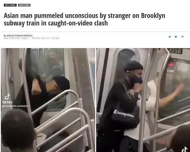 2021年3月29日,一名黑人在纽约地铁上对一名亚裔年轻人施暴,致其晕厥。