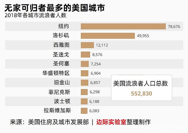2018年美国各城市的流浪汉数量 来源:美国住房与城市发展部 边际实验室整理制作