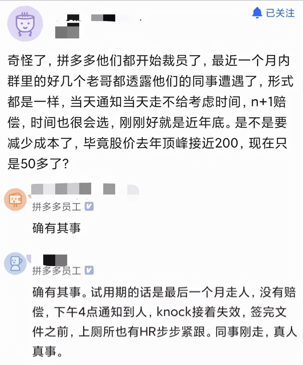 事情的经过是这样的,有网友在脉脉上表示,拼多多裁员不仅涵盖了试用期(无赔偿)和绩效80分以上的正式员工(n+1),谈判过程也堪称戏剧化:有员工称在裁员文件签署完成前,HR不允许其回工位,想打电话或考虑只能留在会议室,甚至上厕所都会有HR步步紧跟,直到签完文件才能被“释放”。