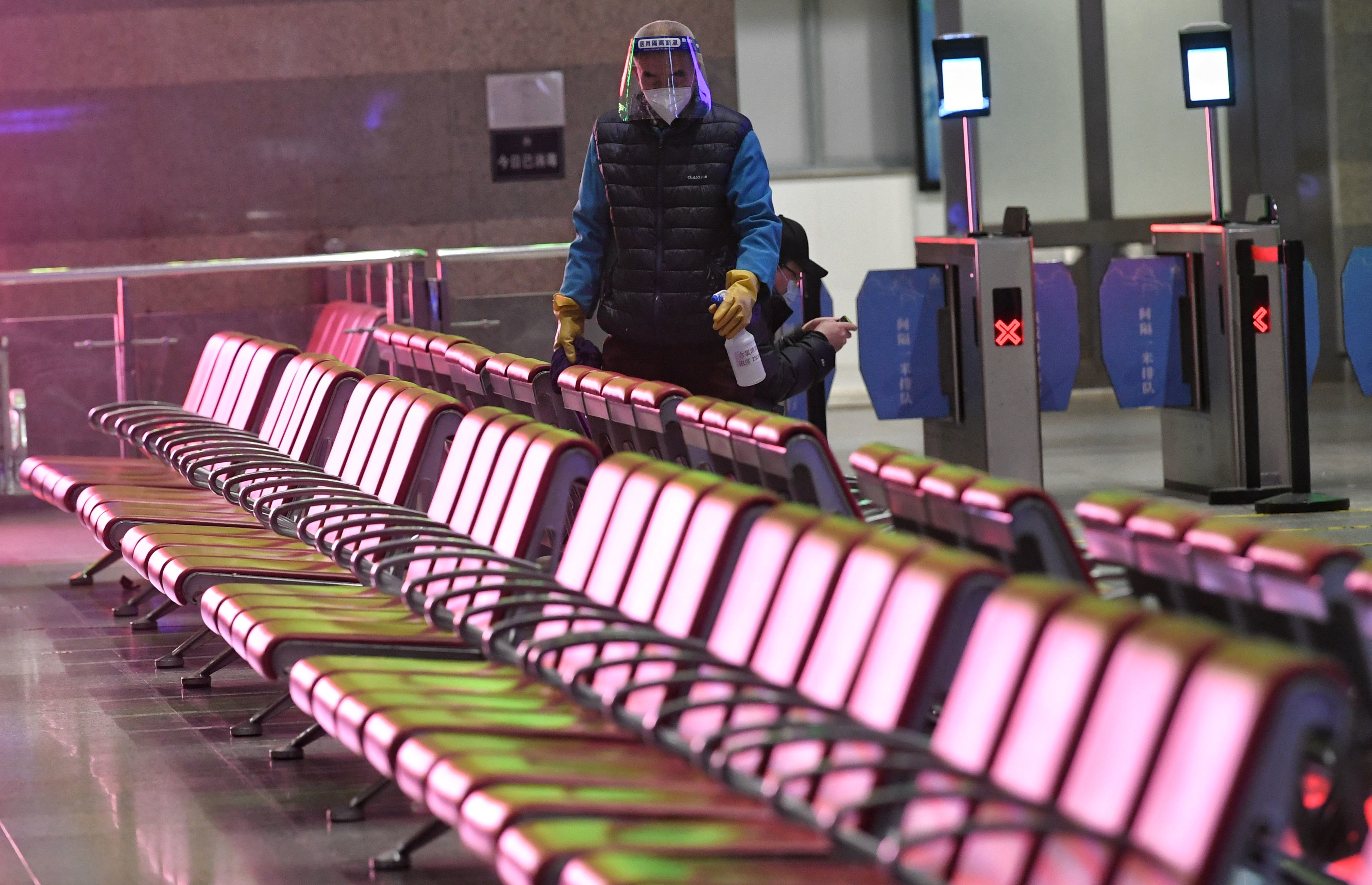 北京西站,工作人员在进行消毒作业。新京报记者 王贵彬 摄