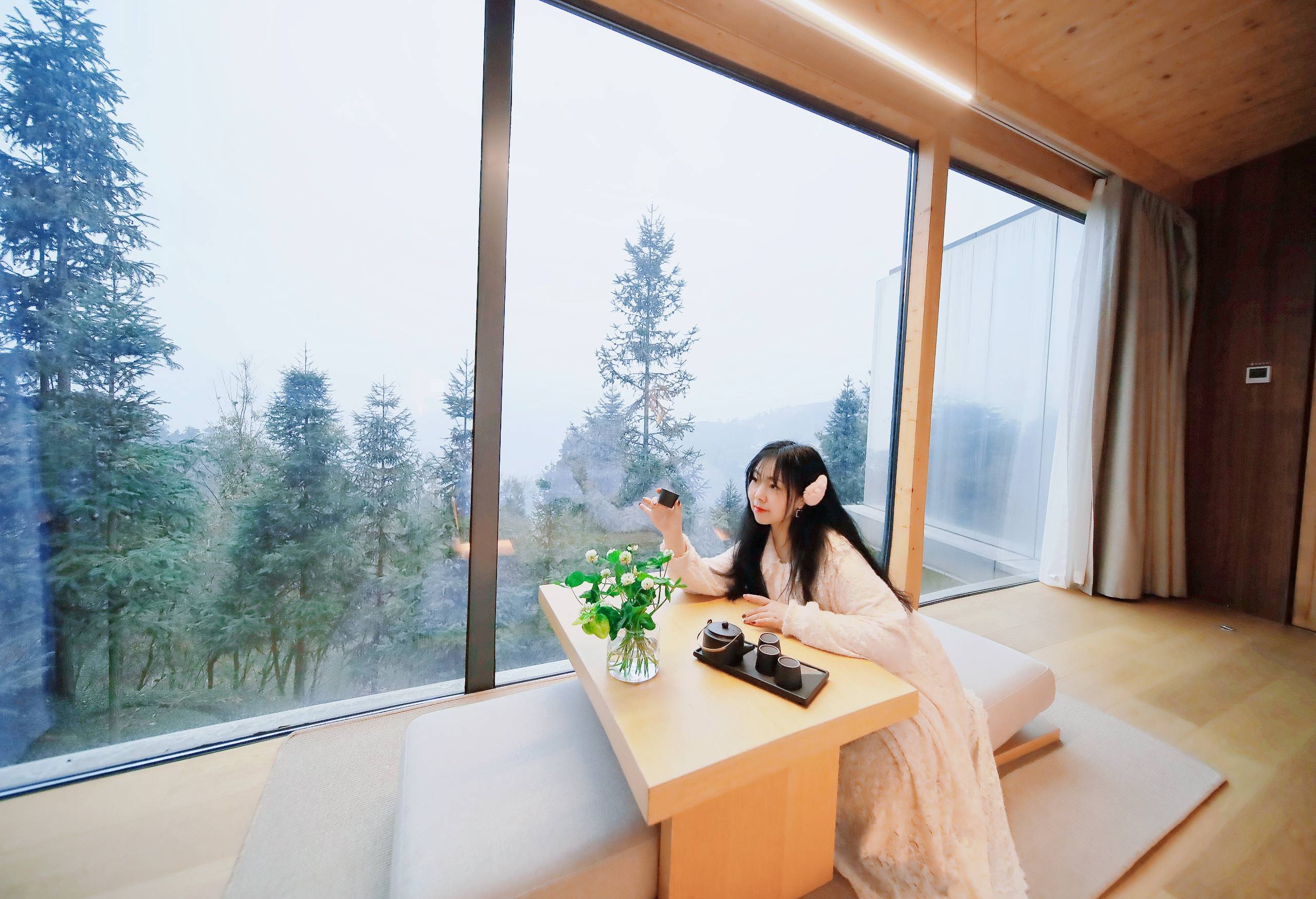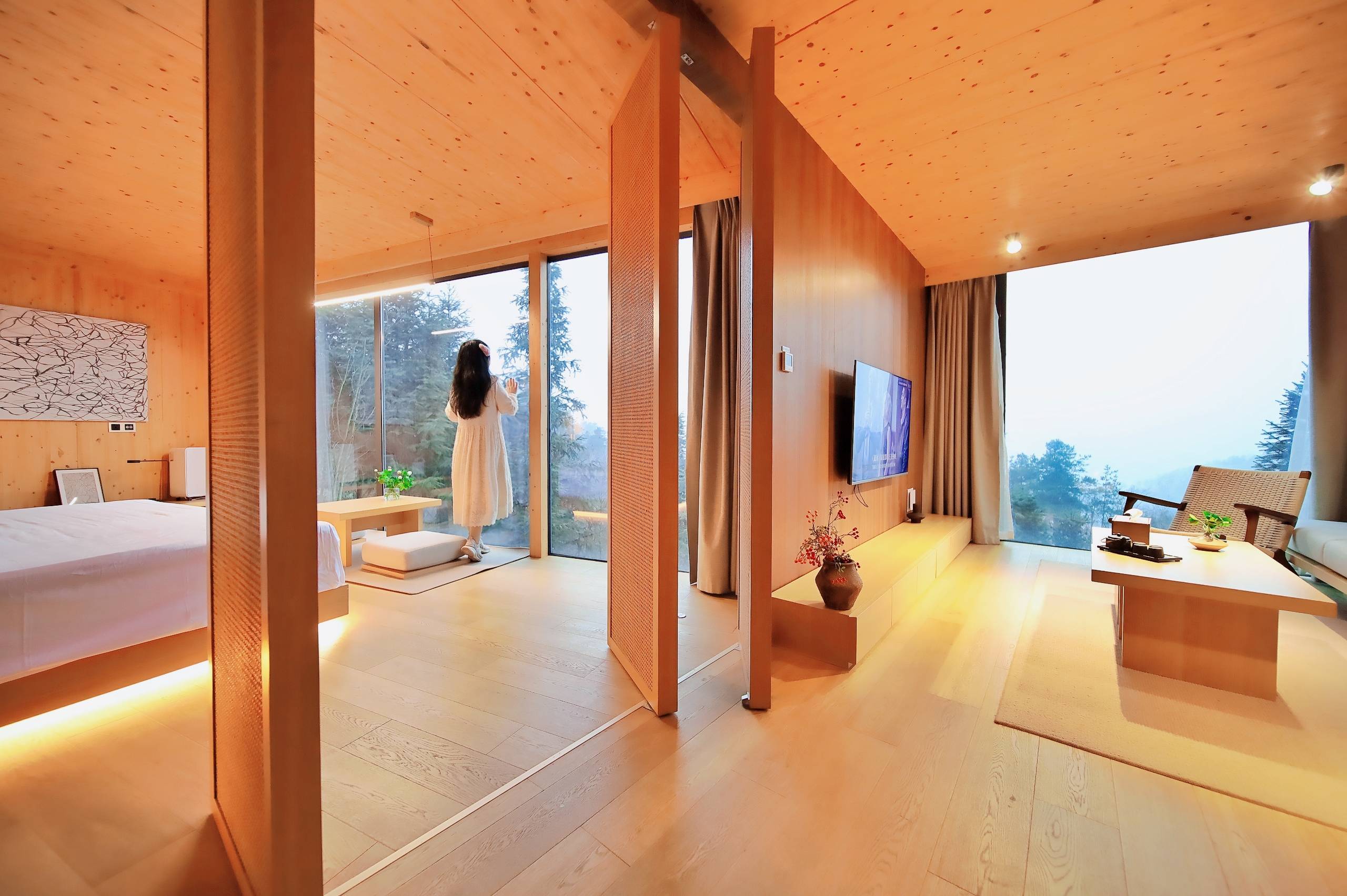 茂密的丛林茶园深处,与山川茶田为邻,木屋立面采用反射性金属材料,可实时映射四季环境,感受充满未来感的建筑设计与自然巧妙的融合,推窗即是云雾林海,放眼望去,仿佛整片高山茶园都是你的。房间是小独栋设计,因山就势,拥有无敌观景落地窗和宽大的露台,深夜独坐幽篁里,同漫天繁星作伴,吟诗品茶好个浪漫。