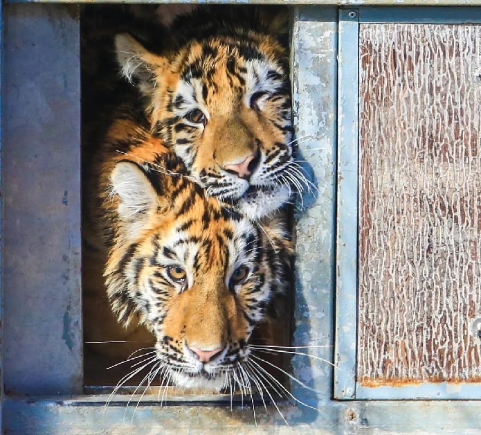 接下来给大家介绍的是2021年6月6日出生的东北虎龙凤胎。据饲养员李师傅介绍,龙凤胎中的女虎宝比较凶,是传说中的“母老虎”,现在的东北虎宝宝体重约七十斤。