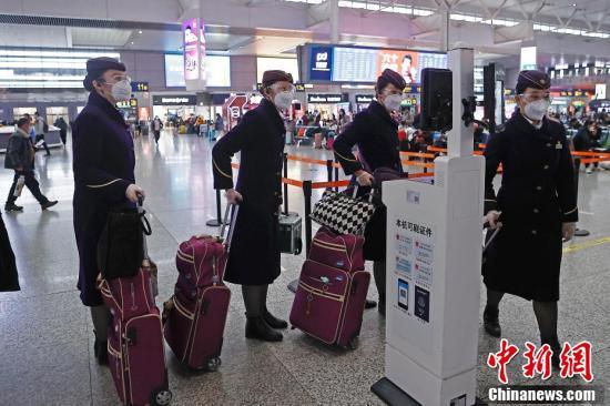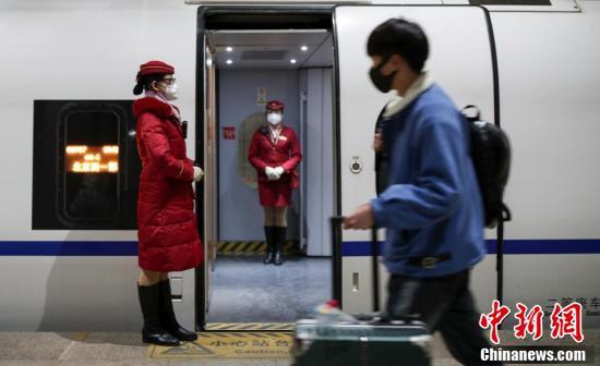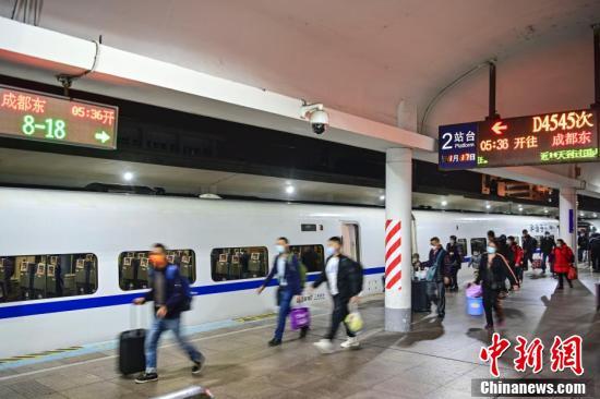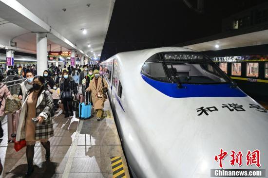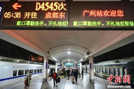 1月17日,广东省广州市,乘坐D4545次列车的旅客在广州站进站乘车。1月17日5点36分,广东春运首日首趟列车D4545次(广州—成都东)从广州站驶出,将于当日14点22分抵达成都东。 中新社记者 陈骥旻 摄