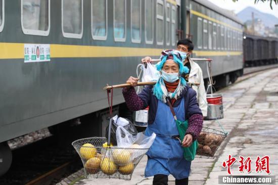 1月17日是2022年春运首日,在贵州省铜仁市玉屏县开往贵阳市的5639次普速列车上,沿线16个站点的山区民众选择乘坐5639次列车前往县城和市区赶集买卖、走亲探友。图为农户挑着蔬菜和稻花鱼走进加劳站。瞿宏伦 摄